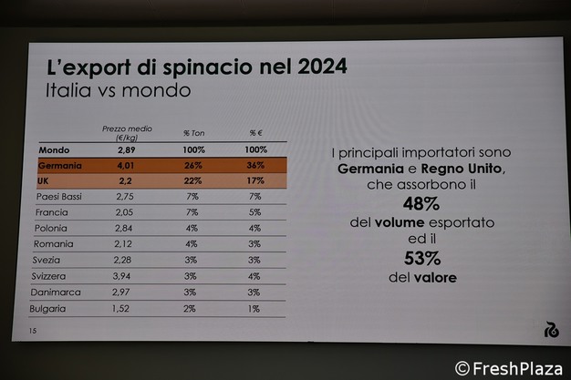 Sul versante commerciale, l'Italia si conferma una potenza esportatrice. Come sottolineato da Toloni: "L'Italia è un esportatore netto di spinacio. Il 47% della produzione totale viene destinata all'export, registrando nel 2024 un totale di 38.000 tonnellate esportate". Questi volumi hanno segnato un incremento del 5% rispetto al 2023, generando un fatturato complessivo di 110 milioni di euro (+7% in valore), a dimostrazione di un comparto in ottima salute. Le esportazioni sono dirette per il 70% verso i paesi europei, con Germania e Regno Unito che si attestano come i principali partner commerciali, assorbendo insieme il 48% dei volumi e il 53% del valore totale esportato. Parallelamente, si registra una dinamica crescente anche sul fronte delle importazioni (+52% nel 2024 per un totale di 3.000 tonnellate), necessarie per colmare i vuoti di offerta durante il periodo estivo; i flussi in entrata provengono principalmente da Svezia e Polonia, che da sole coprono il 55% dell'import.