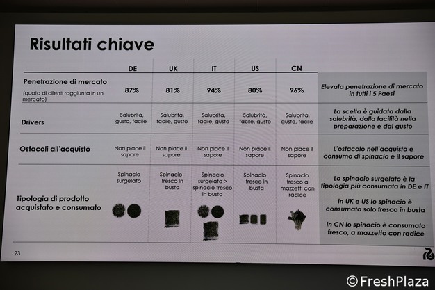Tuttavia, i formati di vendita differiscono profondamente da nazione a nazione. Nei mercati anglosassoni (USA e UK) domina incontrastato lo spinacio fresco venduto in busta, spesso in formati di piccola grammatura (100-200 g), mentre in Germania e in Italia prevale l'acquisto del prodotto surgelato. L'Italia, in particolare, presenta uno scenario peculiare: la busta di spinacio fresco al 100% è in forte espansione (confezioni che arrivano a pesare tra i 500 grammi e il chilo), ma resiste solidamente una fetta di mercato del 43% legata allo spinacio tradizionale venduto a mazzetto con la radice, una tipologia di consumo che, su scala globale, trova un parallelismo quasi esclusivamente nel mercato cinese. Anche nelle insalate miste di quarta gamma (baby leaf e mix salad), lo spinacio è considerato dal 50% degli acquirenti come un ingrediente dal forte valore aggiunto.