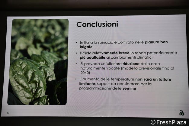 Lo spinacio è una coltura intercalare a ciclo breve, con un optimum termico di crescita ristretto tra gli 8-10°C e i 24°C; al di sotto dei -7°C le plantule subiscono danni letali, mentre al di sopra dei 24°C la pianta entra in stress fotosintetico. Basandosi sui dati dell'Agenzia Internazionale sull'Energia, che certificano per l'Italia un innalzamento termico di 1,24°C nel periodo recente (con proiezioni fino a +2°C al 2040), lo studio ha modellizzato l'idoneità delle principali aree agricole, tra cui il Tavoliere delle Puglie, la Pianura Padana, l'Agropontino, la Piana del Sele e la Piana del Fucino.
