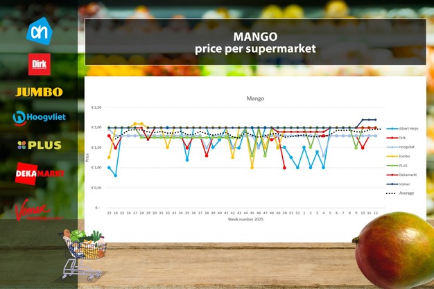 Il prezzo medio del mango resta stabile nella settimana 12 a 1,96 euro per pezzo. Tutti i supermercati mantengono le quotazioni della settimana 11: Albert Heijn 1,99 euro, Dirk 1,79 euro, Hoogvliet 1,79 euro, Jumbo 1,99 euro, Plus 1,99 euro, DekaMarkt 1,99 euro e Vomar 2,19 euro.