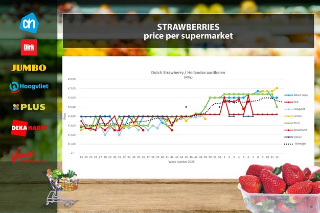 Il prezzo medio settimanale delle fragole cala sensibilmente a 5,55 euro per 400 grammi, con una diminuzione di 27 centesimi rispetto alla settimana 11. Questo calo è dovuto a una forte riduzione di prezzo da Plus: da 6,38 a 4,99 euro (-1,39 euro). Jumbo invece aumenta di 32 centesimi fino a 7,02 euro. Albert Heijn mantiene 5,99 euro e DekaMarkt 4,19 euro. Dirk, Hoogvliet e Vomar non sono presenti questa settimana.
