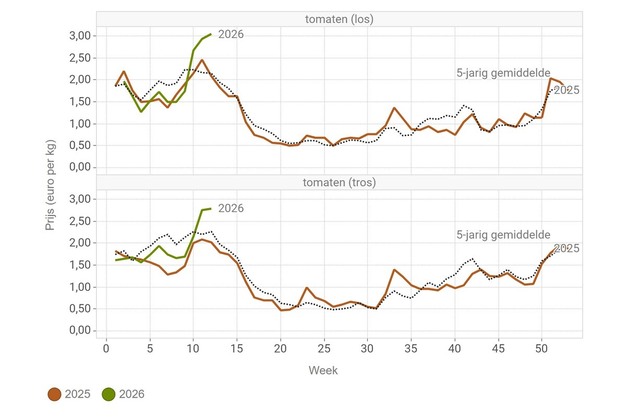 Durante la settimana 12 i prezzi dei pomodori hanno registrato un forte aumento presso le aste della Federazione delle cooperative orticole belghe (VBT). Sebbene i volumi siano superiori rispetto allo stesso periodo dell'anno scorso, i prezzi rimangono ben al di sopra dei livelli di un anno fa. I pomodori sfusi hanno raggiunto un prezzo superiore a 3,00 €/kg, mentre la quotazione media dei pomodori a grappolo si è attestato a circa 2,79 €/kg.