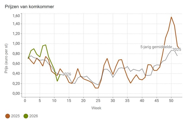 I prezzi dei cetrioli, al contrario, sono diminuiti notevolmente nelle ultime settimane. Alla fine della settimana 12, la quotazione media era tornata al livello della media quinquennale, attestandosi a 0,386 € l'uno. I volumi di cetrioli biologici hanno raggiunto circa 100.000 unità, vale a dire più del doppio rispetto alla stessa settimana dell'anno precedente, anche se i prezzi sono stati leggermente inferiori su base annua, con 0,80 € per unità.