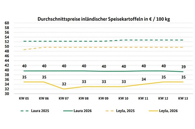 Sul mercato delle patate da mensa, nella settimana 13 era stato previsto un aumento della domanda, dovuta alle vendite pasquali. Anche la vendita diretta dovrebbe beneficiarne. Nella Renania Settentrionale-Vestfalia, i retailer continuano a richiedere contratti di coltivazione per le consegne da agosto fino alla fine di ottobre.