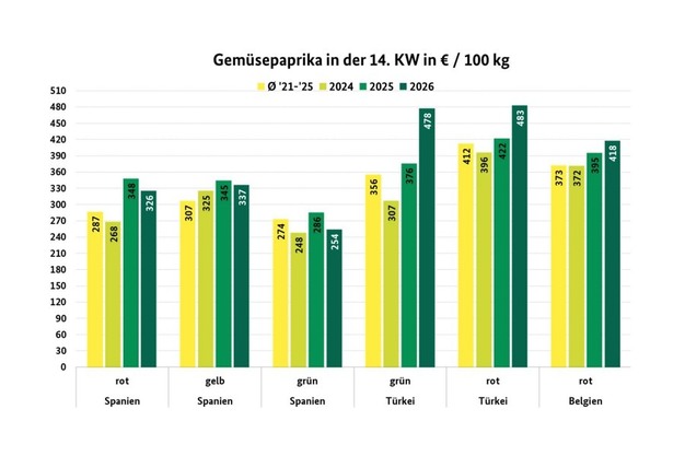 Secondo il rapporto BLE , i prezzi dei prodotti spagnoli, olandesi e belgi hanno spesso mostrato una tendenza al ribasso, sebbene in alcuni giorni si siano registrati anche degli aumenti, con conseguente evidente esitazione da parte degli acquirenti ad Amburgo. A Monaco, i retailer hanno cercato di ridurre le scorte di prodotti spagnoli offrendo delle promozioni. A Francoforte, i peperoni cornetto rossi hanno registrato un prezzo di 8,00 euro e i peperoni quadrati di 7,00 euro al chilogrammo. A Monaco, la stagione tedesca è iniziata con la comparsa dei primi peperoni verdi.
