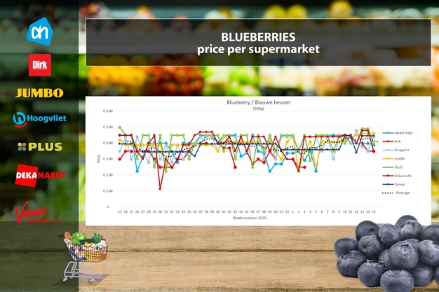 Nella settimana 15 ci sono forti promozioni sui mirtilli (300 g), che fanno scendere il prezzo medio settimanale di ben 20 centesimi fino a 4,04 euro. DekaMarkt, grazie a una riduzione di 1,30 euro, insieme a Dirk è il più economico nella settimana 15 con 3,49 euro, seguito da Albert Heijn (3,89 euro, -10 centesimi) e Plus (3,99 euro, -90 centesimi). L'offerta da Hoogvliet è terminata e lì, insieme a Jumbo, il prezzo supera ampiamente i 4 euro.