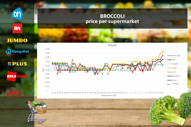 I broccoli continuano ad aumentare: il prezzo medio settimanale è salito di 4 centesimi arrivando a 1,52 euro, con una differenza di 26 centesimi rispetto alla settimana 7. Albert Heijn, Jumbo, DekaMarkt e Vomar hanno aumentato i prezzi di 10-20 centesimi. Albert Heijn e Jumbo sono i più cari con 1,89 euro; Plus è il più economico con 1,19 euro grazie a una promozione. Dirk e Hoogvliet mantengono il prezzo a 1,25 euro.