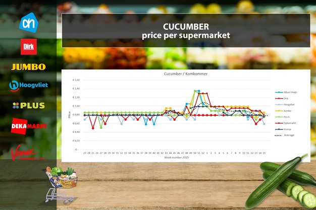 I cetrioli sono stati offerti al prezzo più basso nella settimana 15 da Hoogvliet a €0,59. DekaMarkt riduce il prezzo di 10 centesimi portandolo a 0,79 euro. Plus e Vomar scendono a 0,75 euro, allineandosi al prezzo fisso di Dirk. Il prezzo medio settimanale mostra una tendenza al ribasso dalla settimana 8 e, con 0,76 euro, raggiunge il livello più basso del 2026.