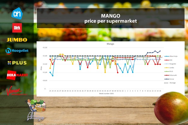 Il mango mostra prezzi stabili in quattro dei sei supermercati monitorati. DekaMarkt, dopo una promozione, riporta il prezzo a 1,99 euro. Vomar è l'unico supermercato con prezzi sopra i 2 euro e, con un aumento di 10 centesimi, si distacca ulteriormente dagli altri (2,29 euro). Il prezzo medio settimanale aumenta di 9 centesimi fino a 1,93 euro.