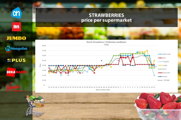 I prezzi delle fragole sembrano stabilizzarsi: Albert Heijn, Plus e DekaMarkt mantengono i prezzi invariati. Jumbo torna al prezzo della settimana 12 (4,99 euro). Hoogvliet si distingue con un'offerta e propone nella settimana 15 pomodori a grappolo a 1,99 euro. Da Dirk e Vomar le fragole (400 g) sono assenti dall'assortimento online dalla settimana 7.