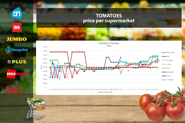 I dati sui prezzi provengono da Supermarktscanner.nl e si basano sui prezzi online nei negozi web di Albert Heijn, Jumbo, Plus, DekaMarkt, Dirk e Hoogvliet. Il prezzo riportato è una media che include anche le promozioni. In questa comparazione non si tiene conto di origine e qualità, poiché la maggior parte dei supermercati non fornisce queste informazioni sui propri siti. Jumbo vende solo pomodori a grappolo confezionati da 5 pezzi invece che a peso (500 g o 1 kg).