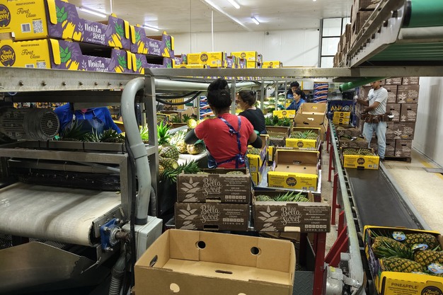 Produrre ananas gialli è tecnicamente impegnativo. Tutti i frutti vengono avvolti sulla pianta per favorire lo sviluppo naturale del colore, anche se il risultato non è mai del tutto prevedibile. Il processo richiede una raccolta selettiva e quotidiana, lasciando che ogni frutto raggiunga il grado di colorazione desiderato invece di raccogliere tutto in una volta, come avviene con l'ananas verde convenzionale. Gli standard di colore vengono classificati nel centro di confezionamento- verde, medio o completamente colorato - in base all'ordine del cliente e al tempo di transito fino a destinazione.