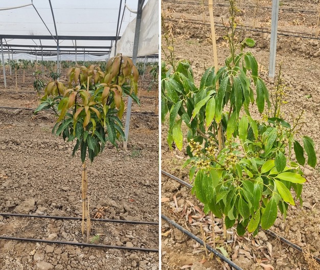 A sinistra: varietà di mango. A destra: campo di prova di litchi, al secondo anno. Piante in fioritura