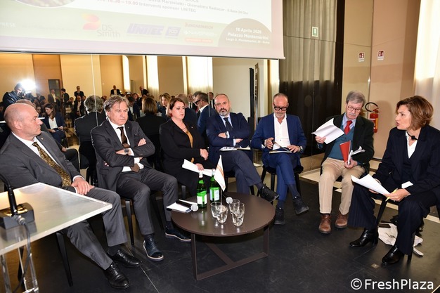 © Giancarlo Fabbri | FreshPlaza.itDa sinistra a destra: Carlo Bevini, Plant General Manager San Felice SP – DS Smith Packaging Italia, Roberto Caponi, Direttore Generale Confagricoltura, Silvia Guaraldi, Segretaria Nazionale FLAI-CGIL,Vincenzo Dell'Orefice, Segreteria generale FISASCAT CISL, Romano Magrini, Responsabile Lavoro Coldiretti, Antonio Vargiu, Segreteria Nazionale UILTUCS e la moderatrice.