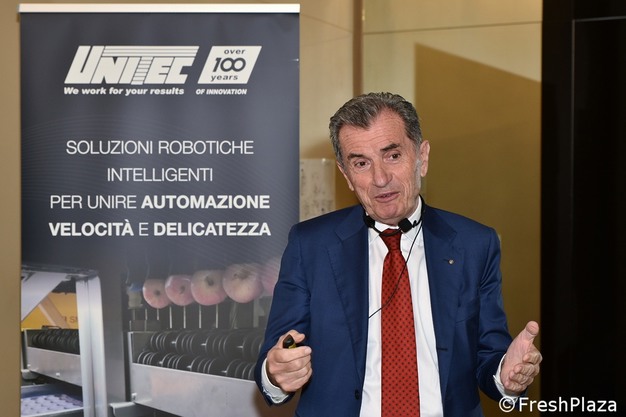 "Tutti quelli che hanno parlato prima di me hanno elencato le difficoltà a gestire la manodopera", ha esordito Benedetti. "Vediamo se è possibile allora supplire a tale carenza con le macchine, l'automazione e la robotica". Unitec seleziona già, grazie alle sue tecnologie avanzate, "450 miliardi di frutti ogni anno" nei magazzini globali. Inoltre, azzera la manodopera in fasi faticose come lo svuotamento bins, la selezione qualitativa interna ed esterna e l'incassettamento. La rivoluzione attesa è però lo spostamento di questi automi all'aperto, nei campi.