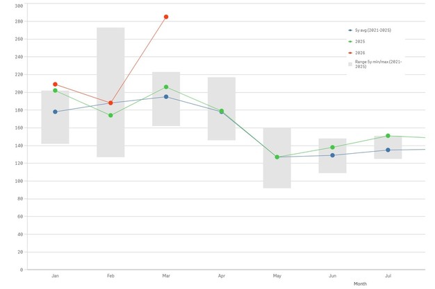 Rispetto alla media quinquennale, a marzo i prezzi risultavano più alti dall'8% fino addirittura al 75%. Fa eccezione solo la quotazione dei pomodori rotondi sfusi nei Paesi Bassi, che è inferiore del 22% rispetto alla media degli ultimi cinque anni, con un prezzo di 1,10 euro/kg. Secondo le statistiche Ue, il prezzo rimane inoltre inferiore del 17% rispetto al 2025.