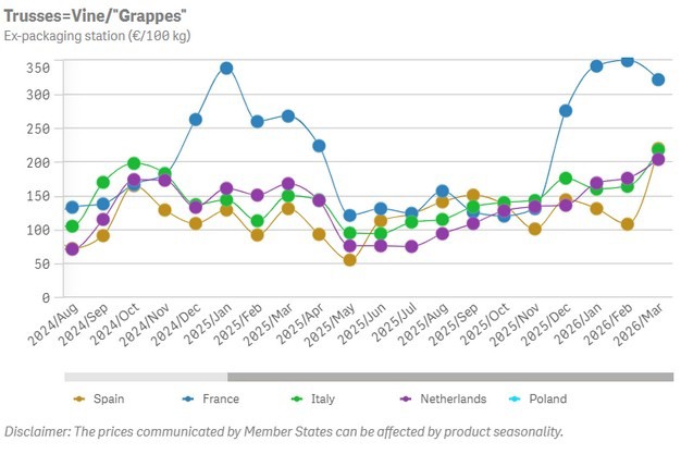 Rispetto ai prezzi di febbraio, le quotazioni sono aumentate quasi ovunque nei Paesi in cui la Commissione europea raccoglie i dati. Solo la quotazione dei pomodori ciliegino e delle varietà speciali nei Paesi Bassi e quello dei pomodori a grappolo in Francia non sono aumentati a marzo.