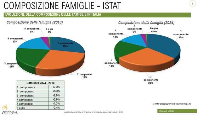 Le elaborazioni Ismea su dati Istat, mostrano come al 2025 in Italia si contano oltre 26,6 milioni di famiglie, circa 4 milioni in più rispetto a vent'anni fa, ma con una composizione profondamente cambiata. Infatti le famiglie unipersonali rappresentano il 37% del totale e il 17% della popolazione con una crescita del 7,8% rispetto al 2010, mentre le coppie con figli sono il 28% e le famiglie monogenitoriali l'11%, nella maggior parte dei casi guidate dalla madre. Inoltre si registra una riduzione dei nuclei più numerosi con un calo delle famiglie di tre e quattro componenti rispettivamente del 2,9 e del 3,9% tra il 2010 e il 2024.