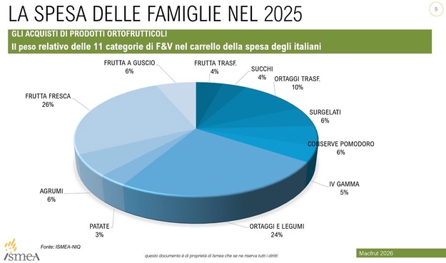 Se parliamo di quote dell'ortofrutta, nel 2024, la spesa per frutta e verdura è stata di 42,6 miliardi di euro, incidendo per circa il 23% sul carrello alimentare complessivo. Il 2025 ha visto un aumento diffuso dei consumi di prodotti ortofrutticoli, sia in valore sia in volume. In particolare, sono cresciuti gli acquisti di ortaggi (+3,3%), patate (+5,3%) frutta a guscio (+2,7%), conserve vegetali e legumi in scatola (+0,7%), ortaggi surgelati (+0,8%), patate surgelate (+1,4%), castagne (+4,6%), kiwi (+7,2%), fragole (+8,9%), con performance particolarmente dinamiche per alcune categorie come i frutti rossi (mirtilli +26%, more +37%) e la frutta tropicale (mango +36%, avocado +47%).