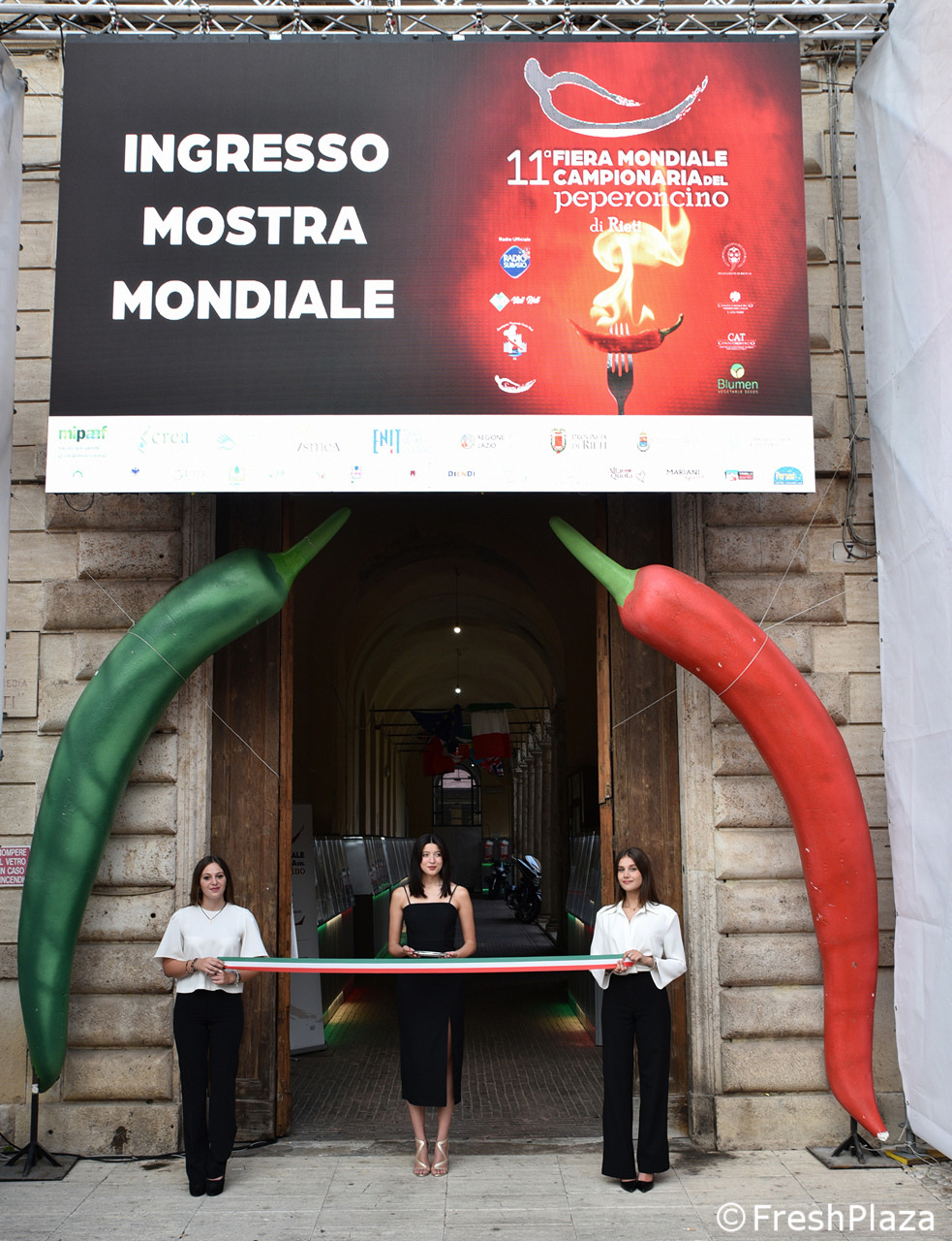 Il momento del taglio inaugurale del nastro relativo alla mostra campionaria che raccoglie quasi 500 diverse varietà di peperoncino. Il Sindaco di Rieti, Daniele Sinibaldi, tiene le forbici insieme a Mariano Calisse, presidente della provincia. Alla sua destra, Livio Rositani, presidente dell'Associazione Rieti Cuore Piccante, organizzatrice dell'evento ideato dal padre di Rositani.