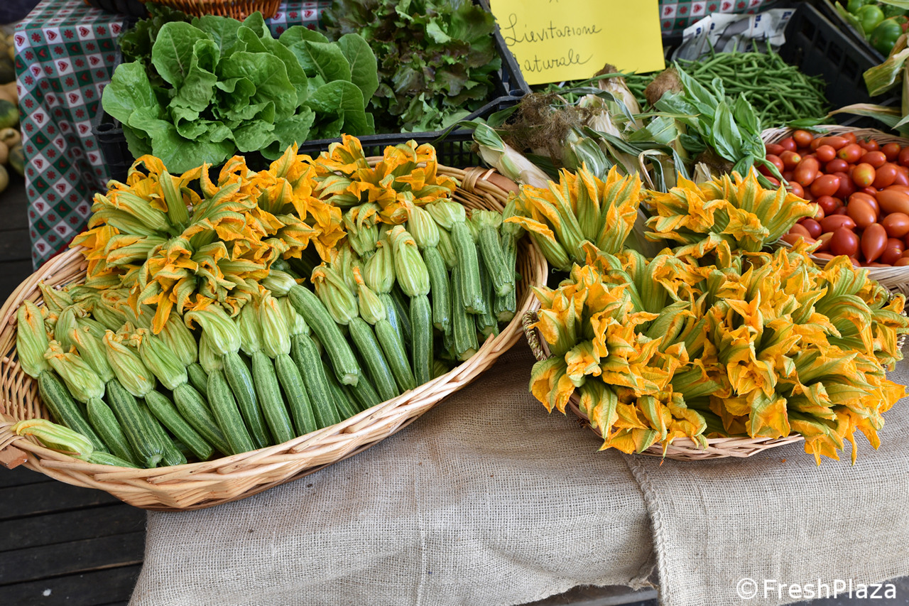 Un dettaglio delle zucchine romanesche con fiore e fiori venduti separatamente.