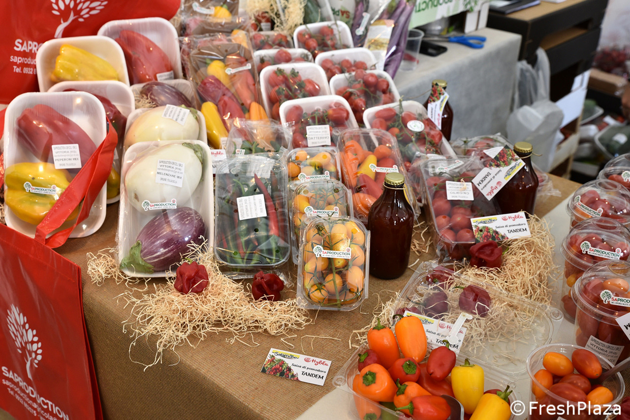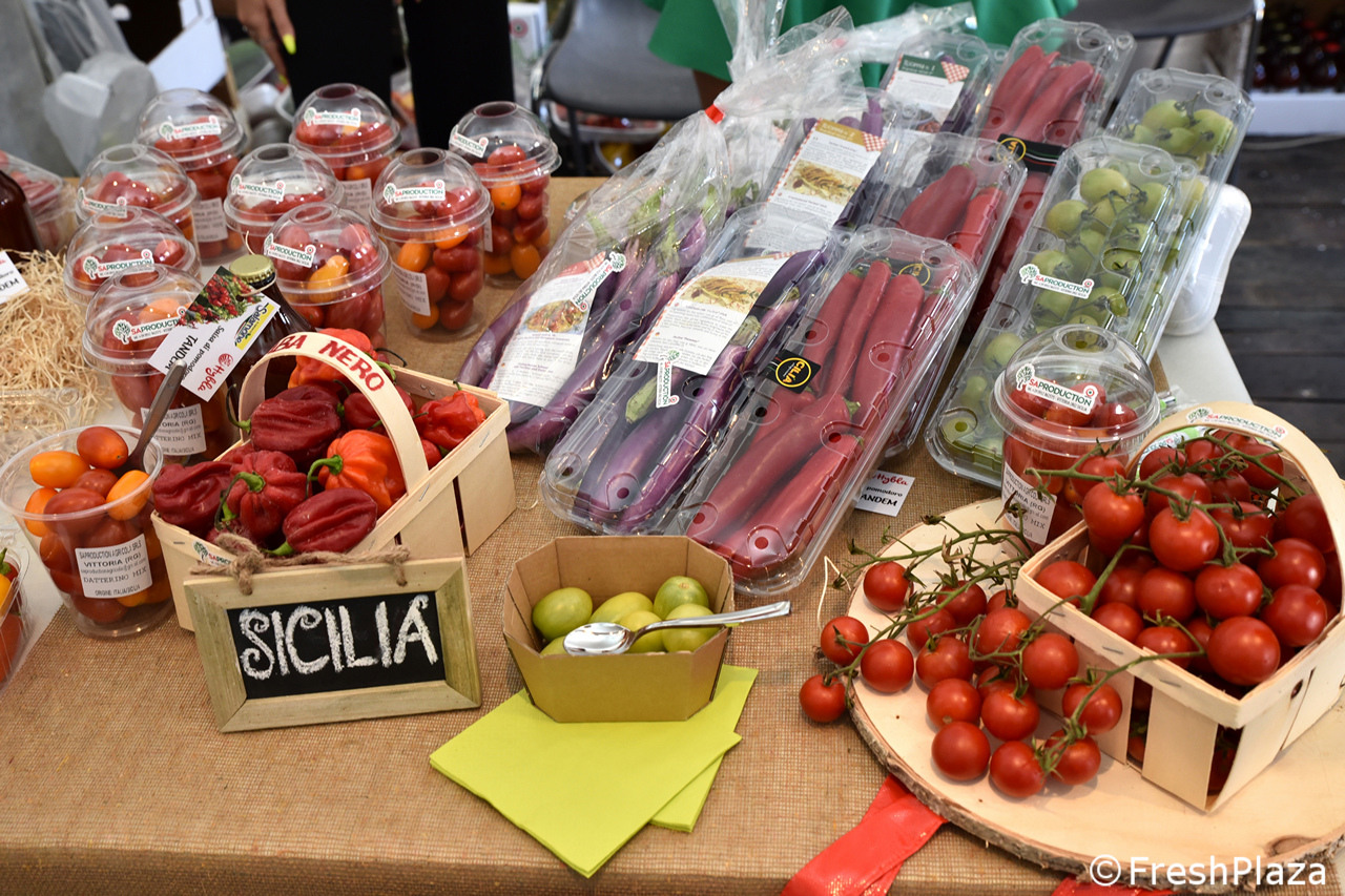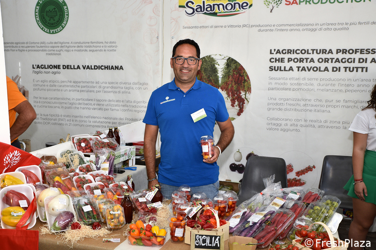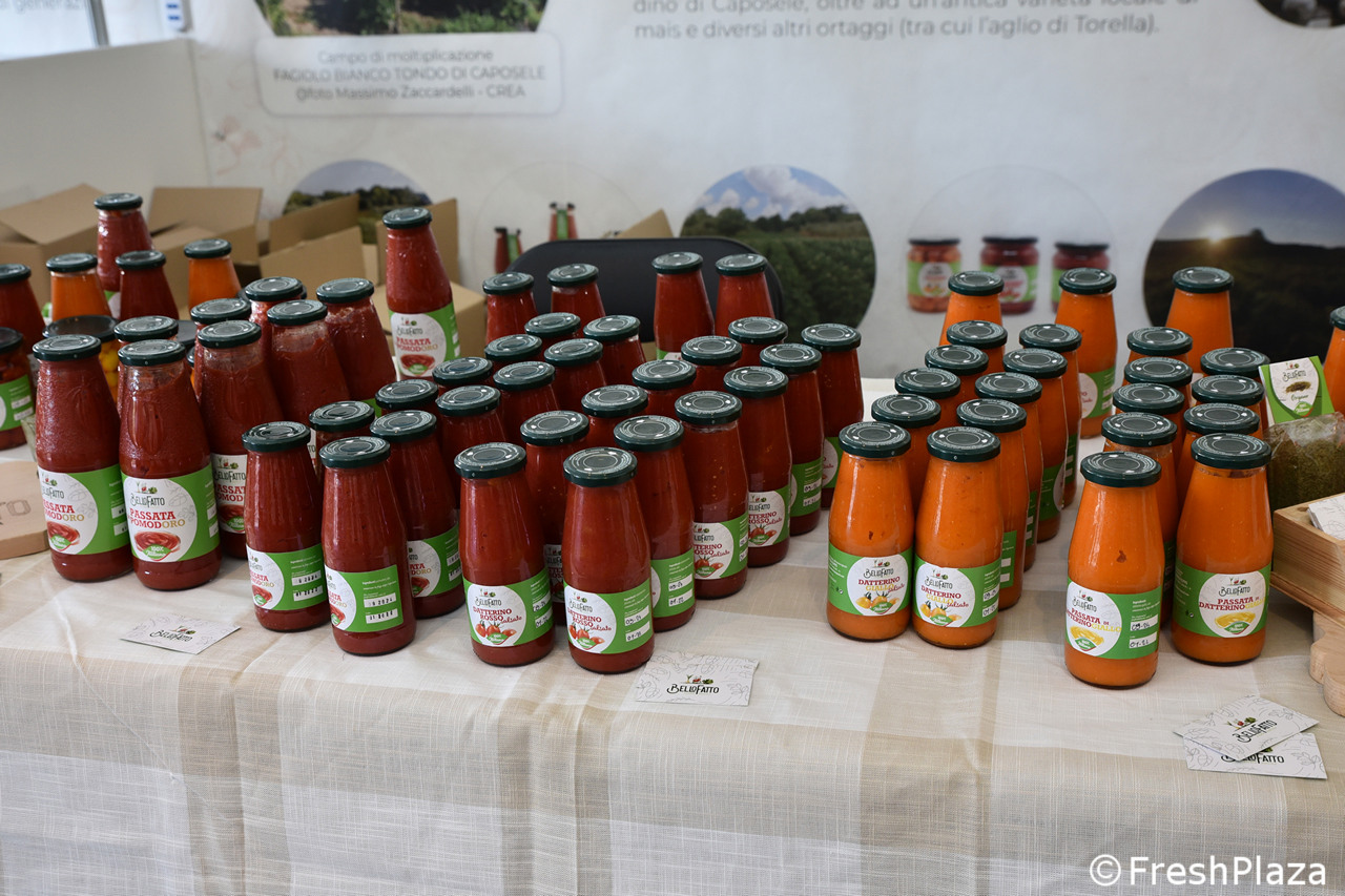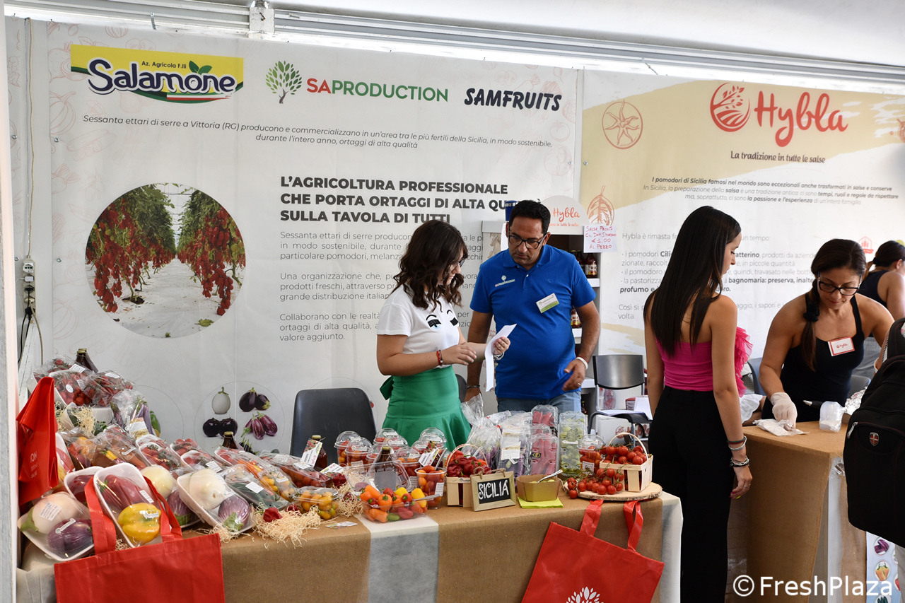 Prodotti in esposizione presso lo stand dell'azienda agricola F.lli Salamone di Vittoria (RG). Una grande impresa che coltiva durante l'intero anno in una tra le aree più fertili della Sicilia, commercializzando attraverso i propri marchi in tutta Italia. L'assortimento include ortaggi di alta qualità, tra i quali gli iconici pomodori e collabora con realtà locali per la trasformazione della materia prima in prodotti di alto valore gastronomico.
