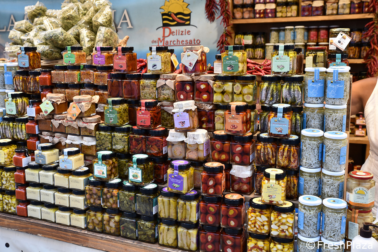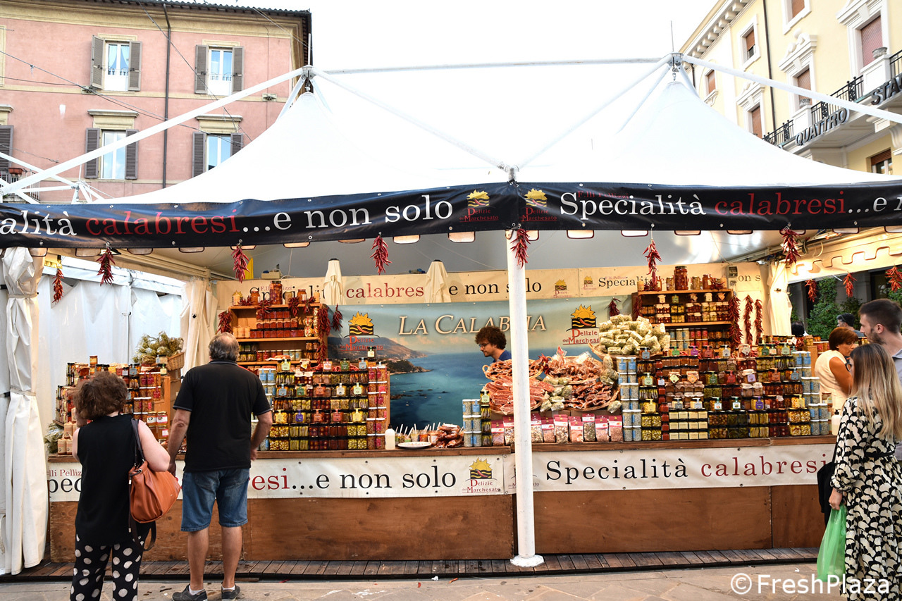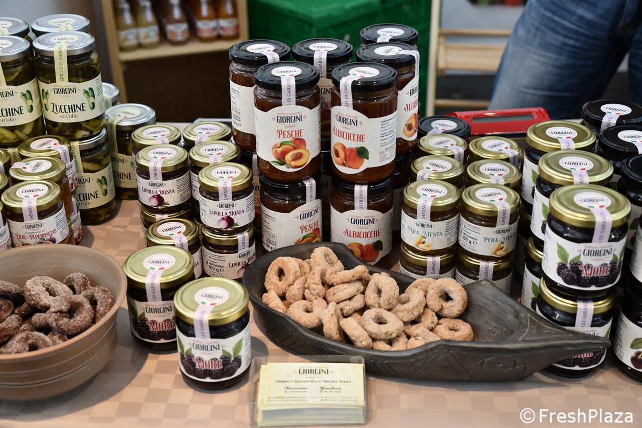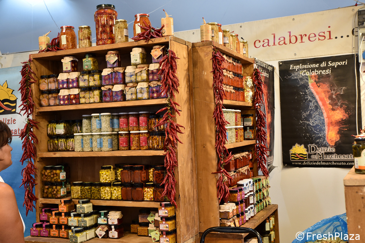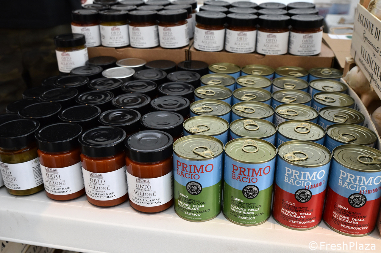 Prodotti in esposizione presso lo stand dell'azienda agricola F.lli Salamone di Vittoria (RG). Una grande impresa che coltiva durante l'intero anno in una tra le aree più fertili della Sicilia, commercializzando attraverso i propri marchi in tutta Italia. L'assortimento include ortaggi di alta qualità, tra i quali gli iconici pomodori e collabora con realtà locali per la trasformazione della materia prima in prodotti di alto valore gastronomico.