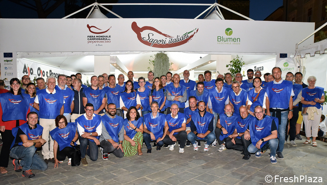 Massimo Tamburini di Blumen (con in mano una pianta di peperoncino) presso uno degli stand del padiglione Sapori Italiani. Alla sua sinistra, nell'ordine, Stefano Petrucci e Alberto Dezza. Alla sua destra, Leonardo Bonifazi e Riccardo Maglioni (primo a sx nella foto).