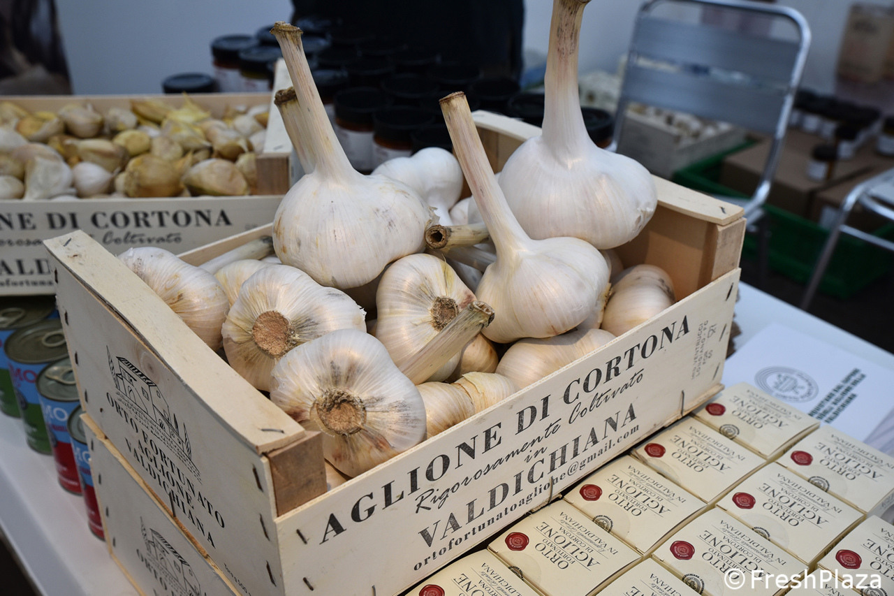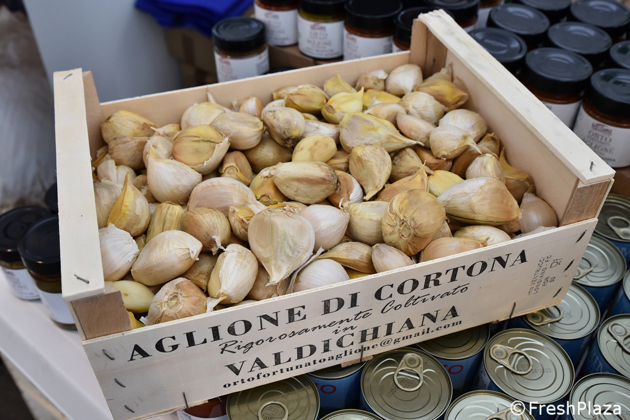 Grazie all'assenza di allina, l'aglione (qui in spicchi) presenta un sapore delicato e un'alta digeribilità, cosa per cui è anche noto come "l'aglio del bacio". Viene coltivato in 21 comuni tra Arezzo, Siena e Perugia. Questa particolare produzione è stata riscoperta 5-6 anni fa, grazie all'impegno di 52 produttori consorziati. L'azienda Orto Fortunato è capofila, con ben 20 ettari di aglione, previsti in crescita per la prossima campagna.