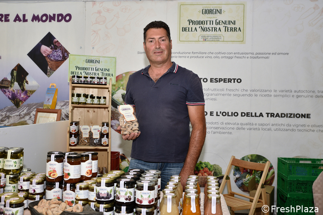 Dalla Tuscia, esposizione di prodotti a guscio e trasformati da parte dell'azienda agricola Giorgini di Tarquinia (VT). In foto, il titolare Nazareno Giorgini con una confezione di biscotti alle mandorle, principale produzione aziendale, oltre agli ortaggi.