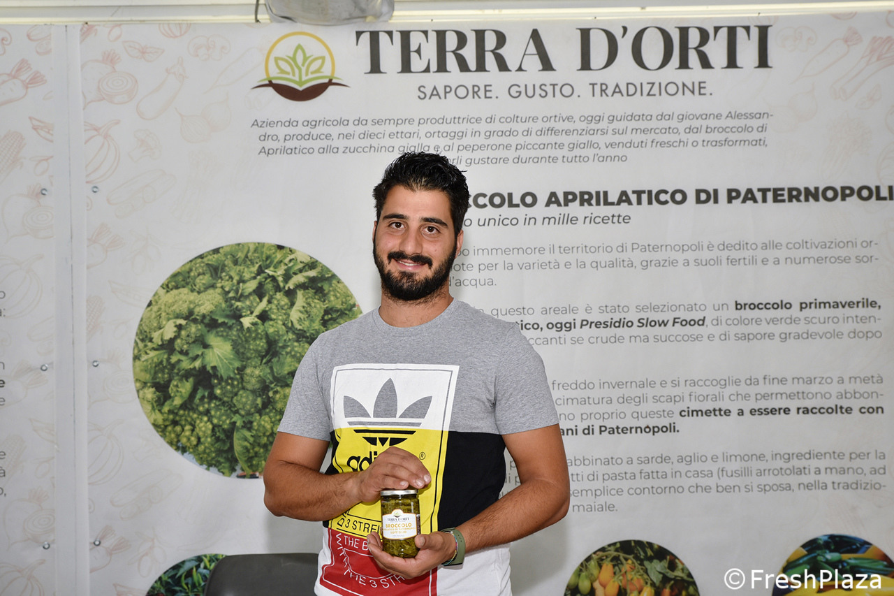 In rappresentanza dell'azienda agricola Terra D'Orti, Alessandro, che mostra un vasetto di conserva di broccolo Aprilatico di Paternopoli (AV). Questo ortaggio primaverile, frutto di una selezione operata secoli fa. si distingue per le cime croccanti se crude, ma succose e di sapore gradevole dopo la cottura. Si raccoglie dalla fine di marzo fino alla metà di maggio. E' un ortaggio tuttavia delicato e altamente deperibile, cosa per cui trasformarlo in conserva ne consente una distribuzione più ampia.