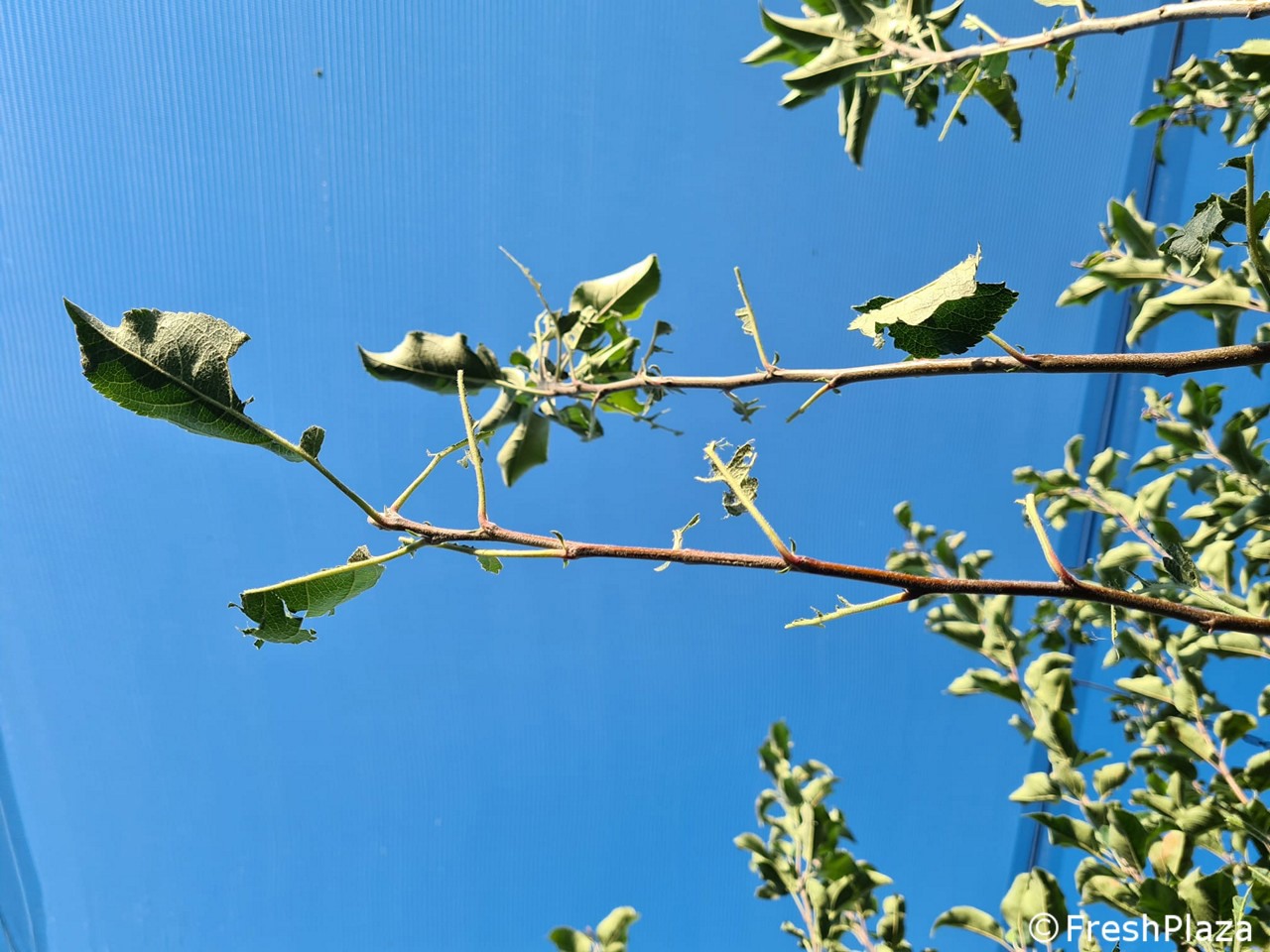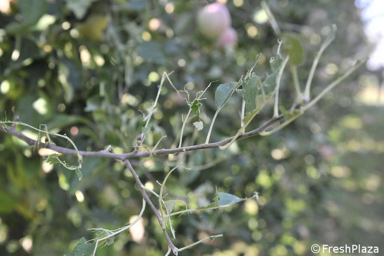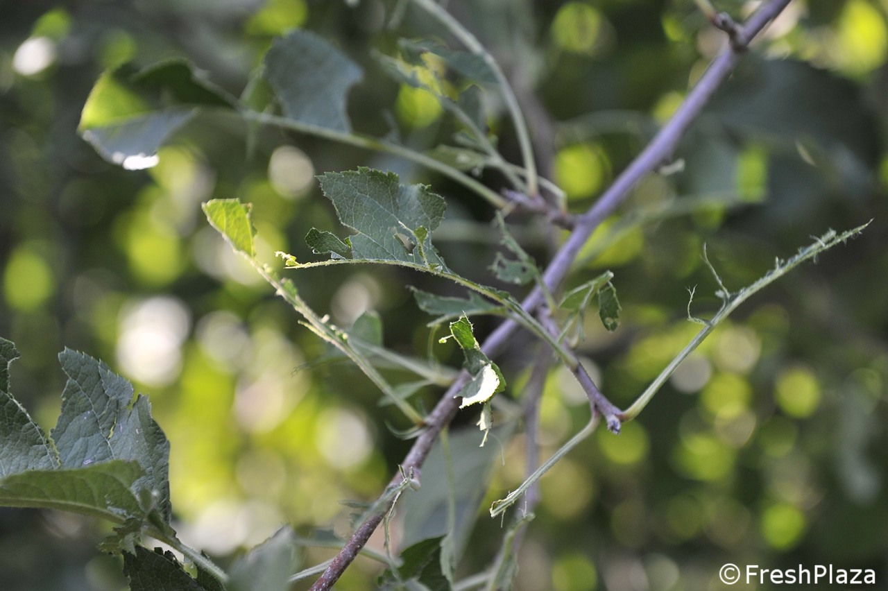 Si notano pezzetti di foglia che arrivano da sinistra, dove sta operando la defogliatrice