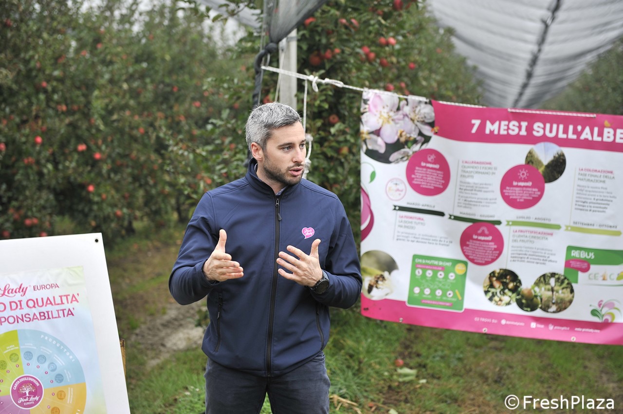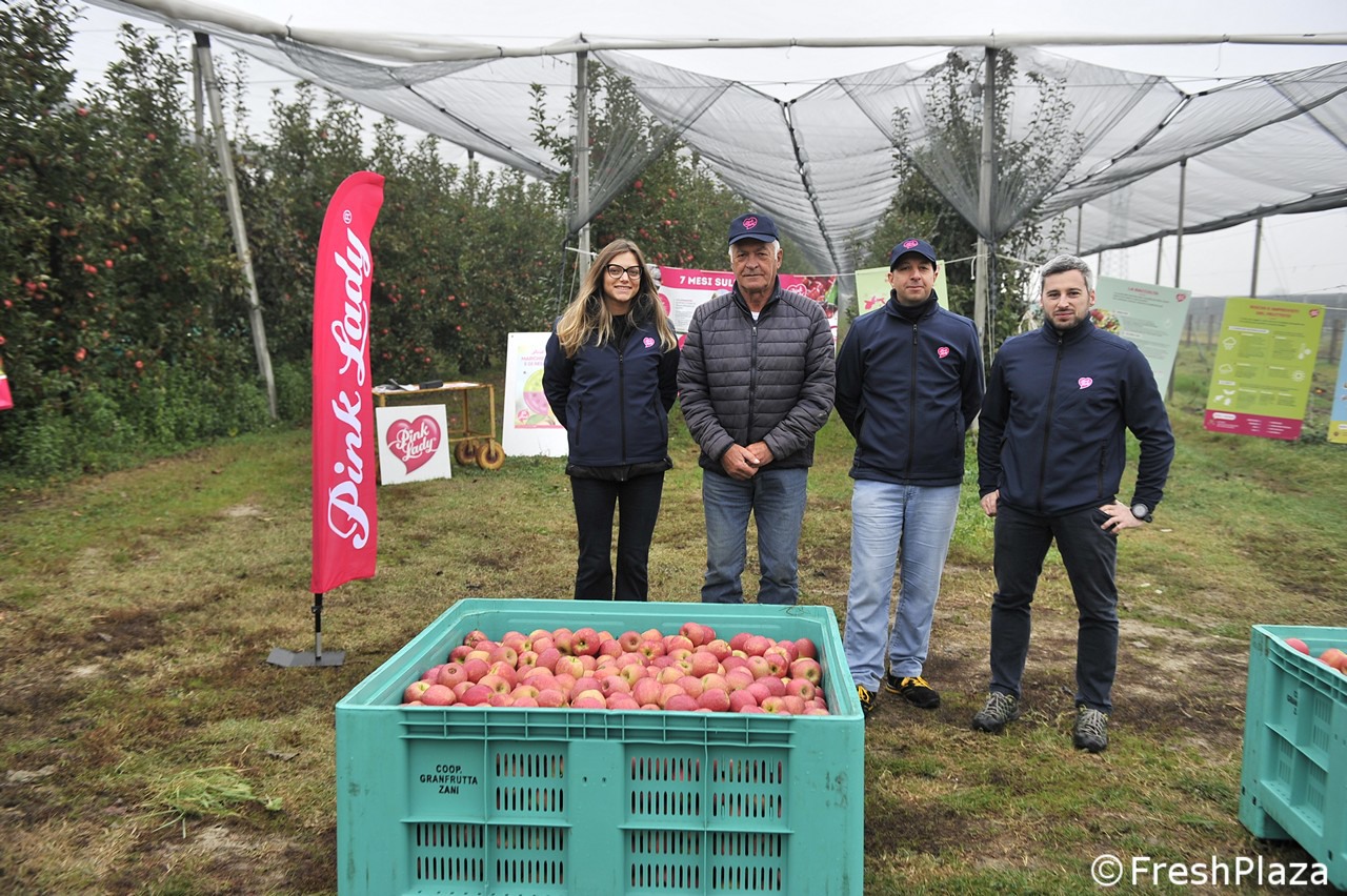 In visita ai meleti e allo stabilimento di lavorazione. Il Pink Lady Day 2022 presso Granfrutta Zani si è svolto giovedì 10 e venerdì 11 novembre. Alcune decine di studenti dell'Istituto professionale per l'agricoltura "Persolino" hanno potuto vedere da vicino, e imparare, la filiera della Pink Lady. Nella foto, poco prima dell'arrivo degli studenti, da sinistra Silvia Montanari (Granfrutta Zani), Giuseppe Sisti (produttore), Alessandro Paganini e Lorenzo Donati, entrambi di Granfrutta Zani (fotoservizio Cristiano Riciputi)