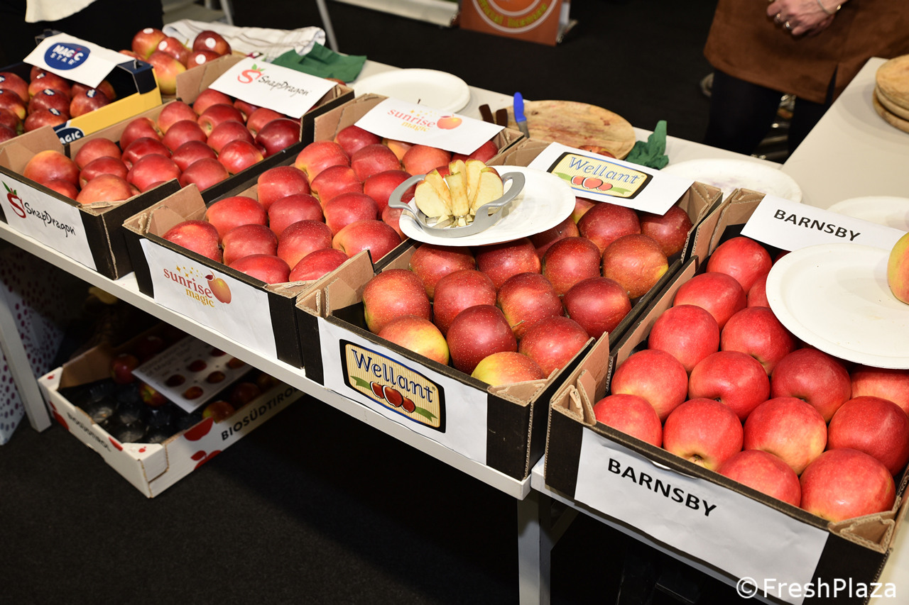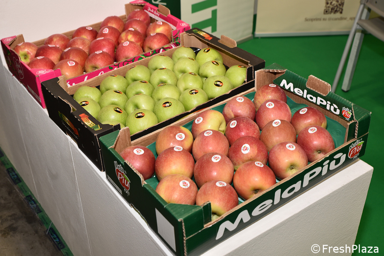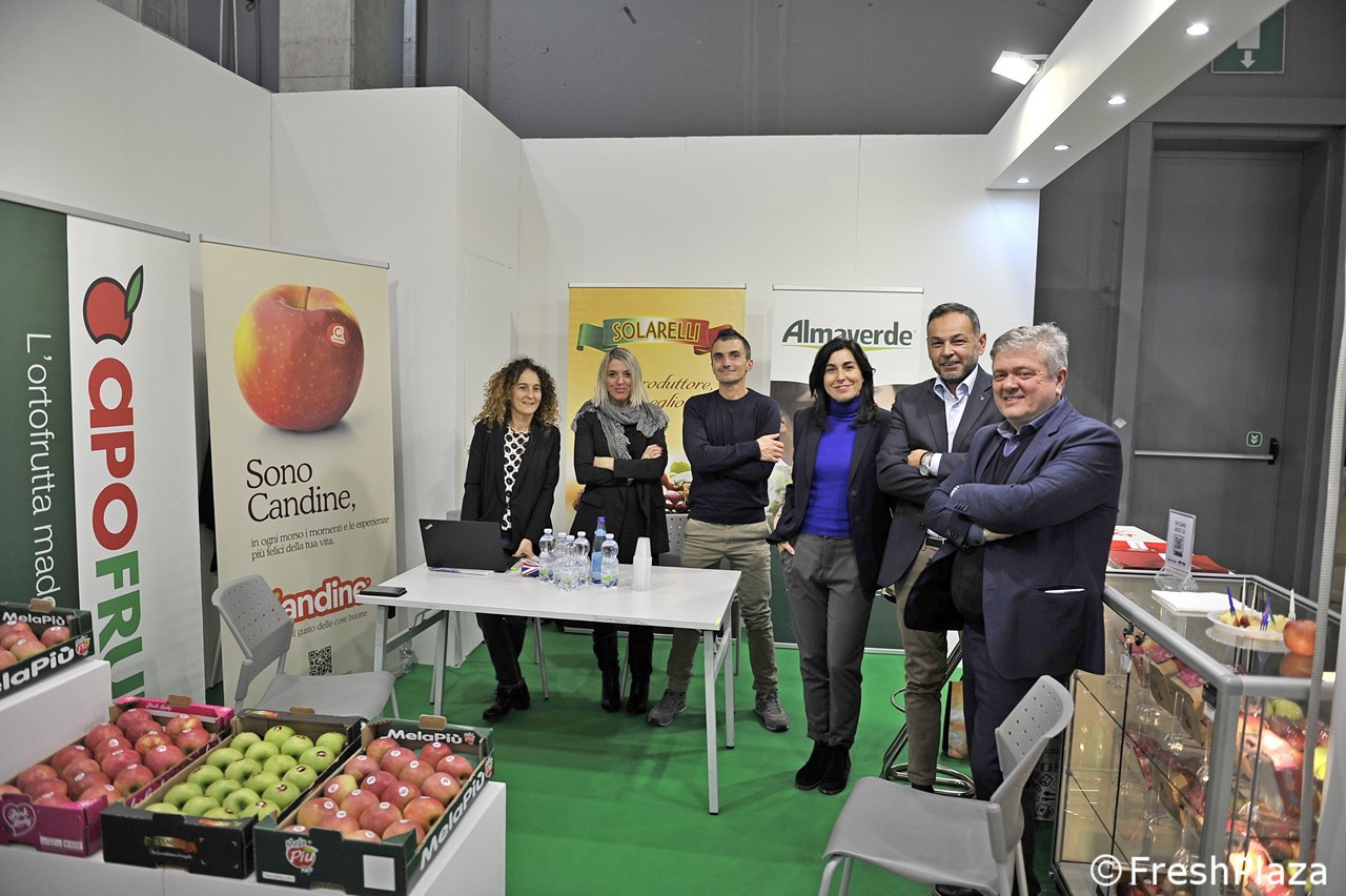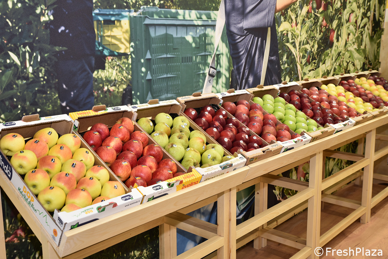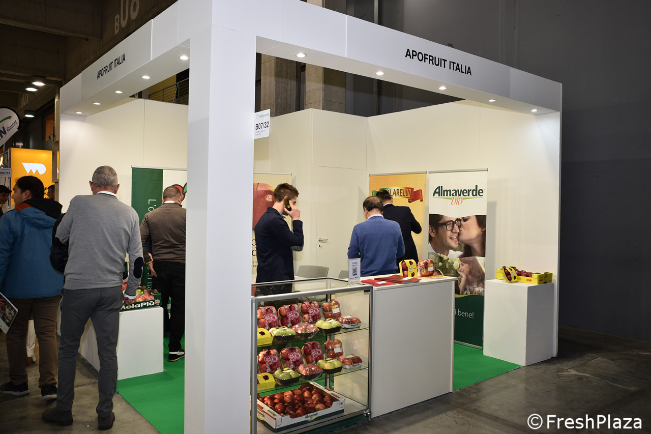 Bella esposizione di mele allo stand della cooperativa Apot.