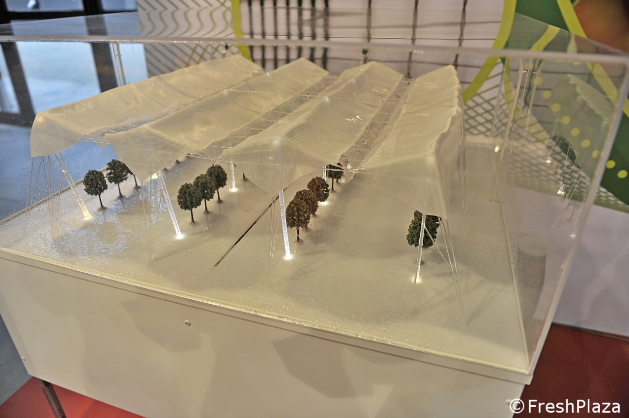 Un plastico che mostra come funziona la protezione di un frutteto (stand Artes Politecnica)