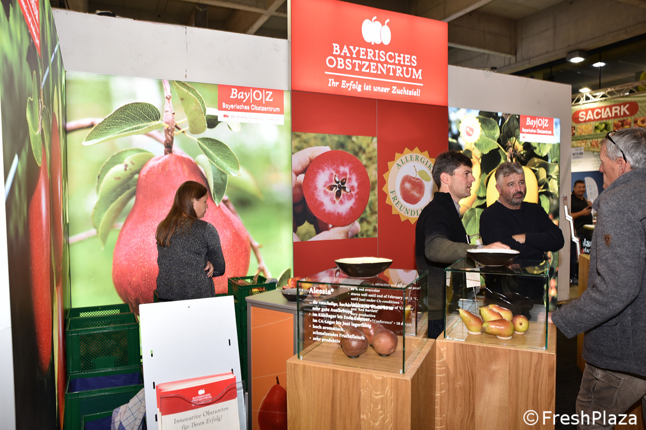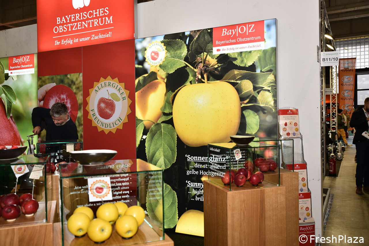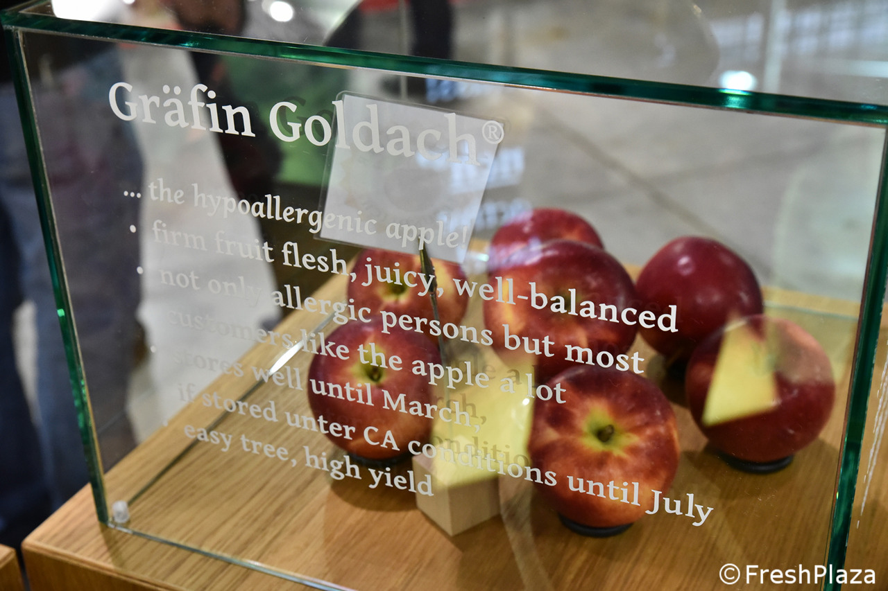 Nello stand del Bayerisches Obstzentrum (Centro bavarese di pomologia e di breeding della frutta) sono state allestite delle teche, con vetrofanie descrittive per le varie selezioni, alcune delle quali connotate da un tratto ipoallergenico. Vedi una carrellata nelle foto seguenti.