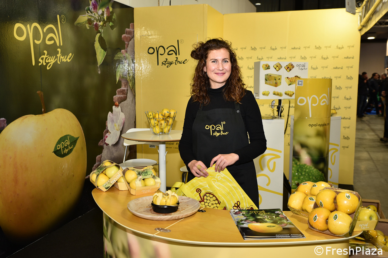 Assaggi presso lo stand della mela Opal®, marchio commerciale della varietà brevettata, che viene gestita in Europa e nella regione del Mediterraneo esclusivamente da partner licenziatari di fruit.select GmbH.