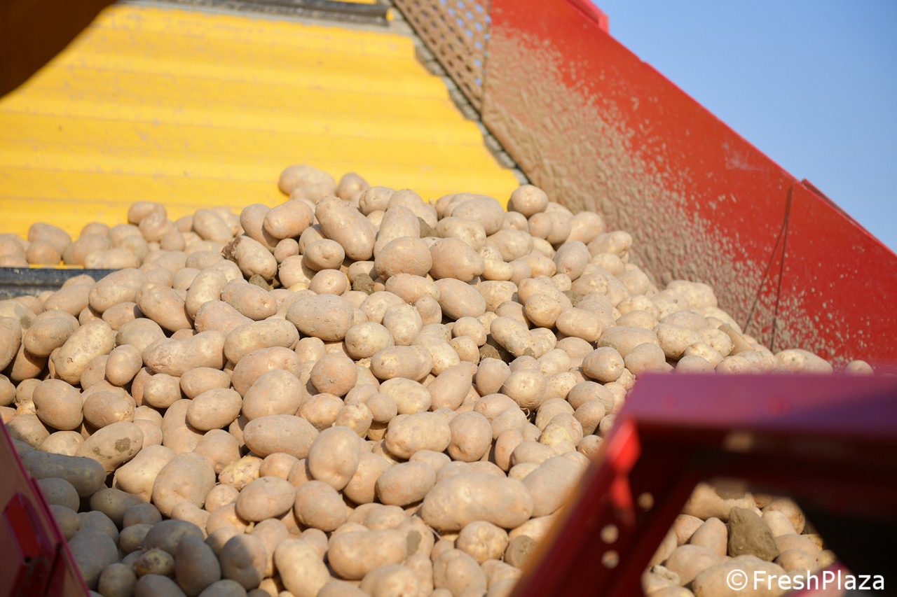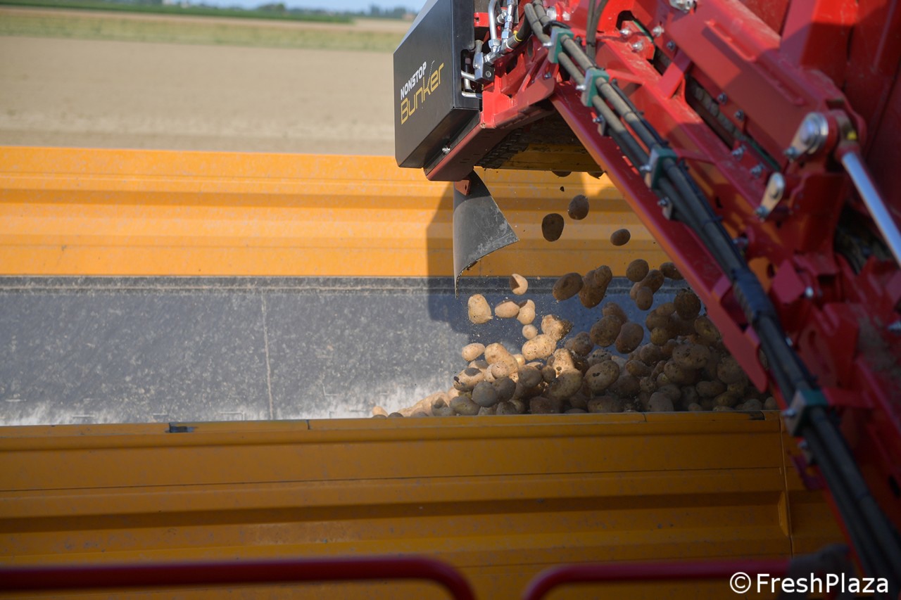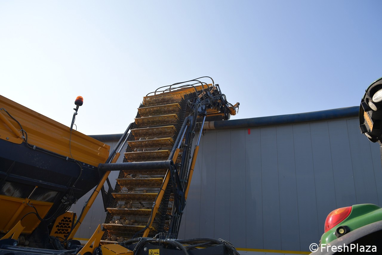 Le patate passano al rimorchio di campo che fa la spola fra la macchina raccoglitrice e il camion per il trasporto in stabilimento