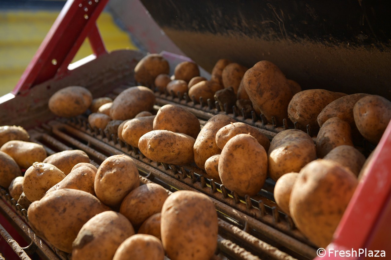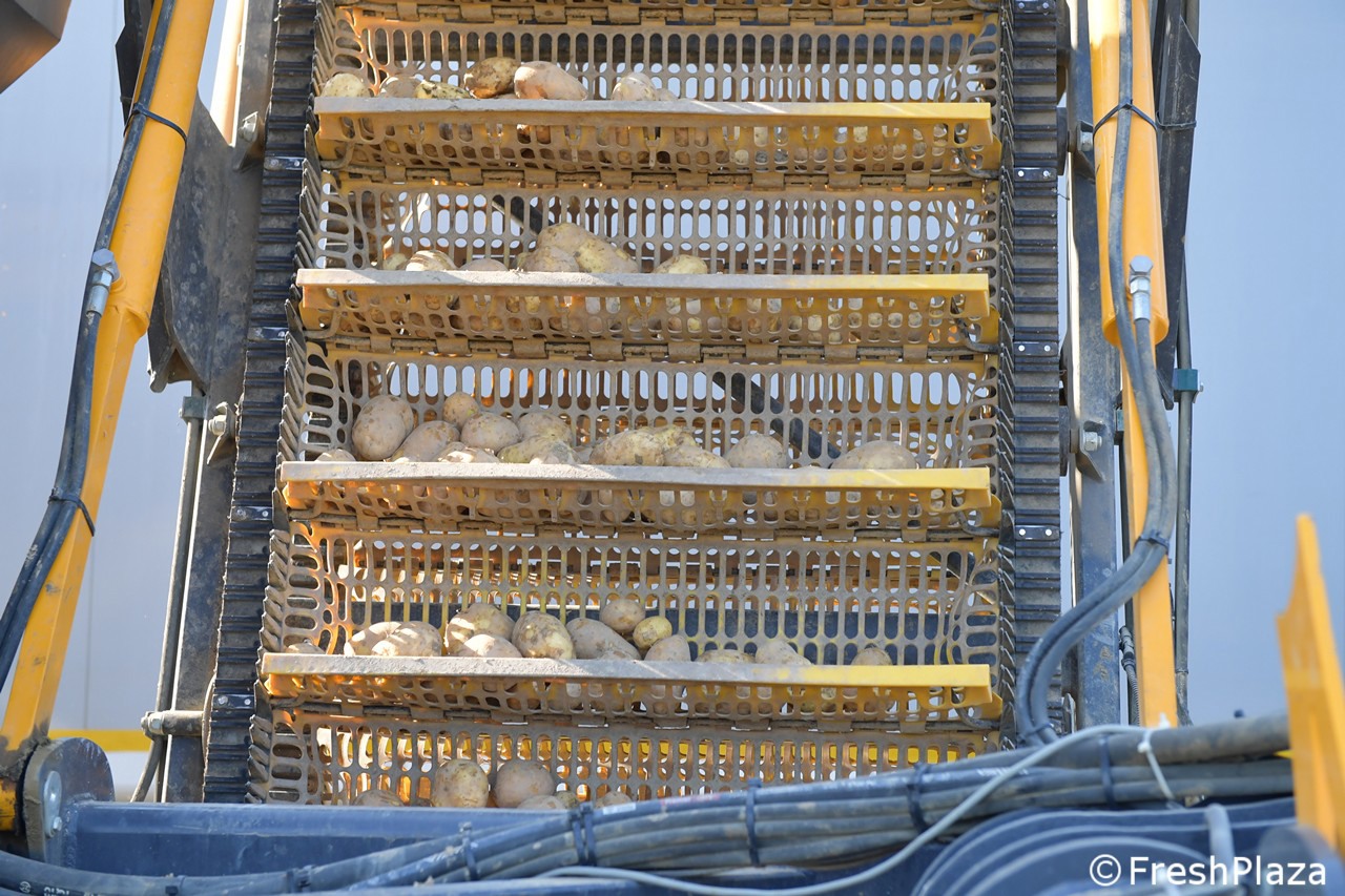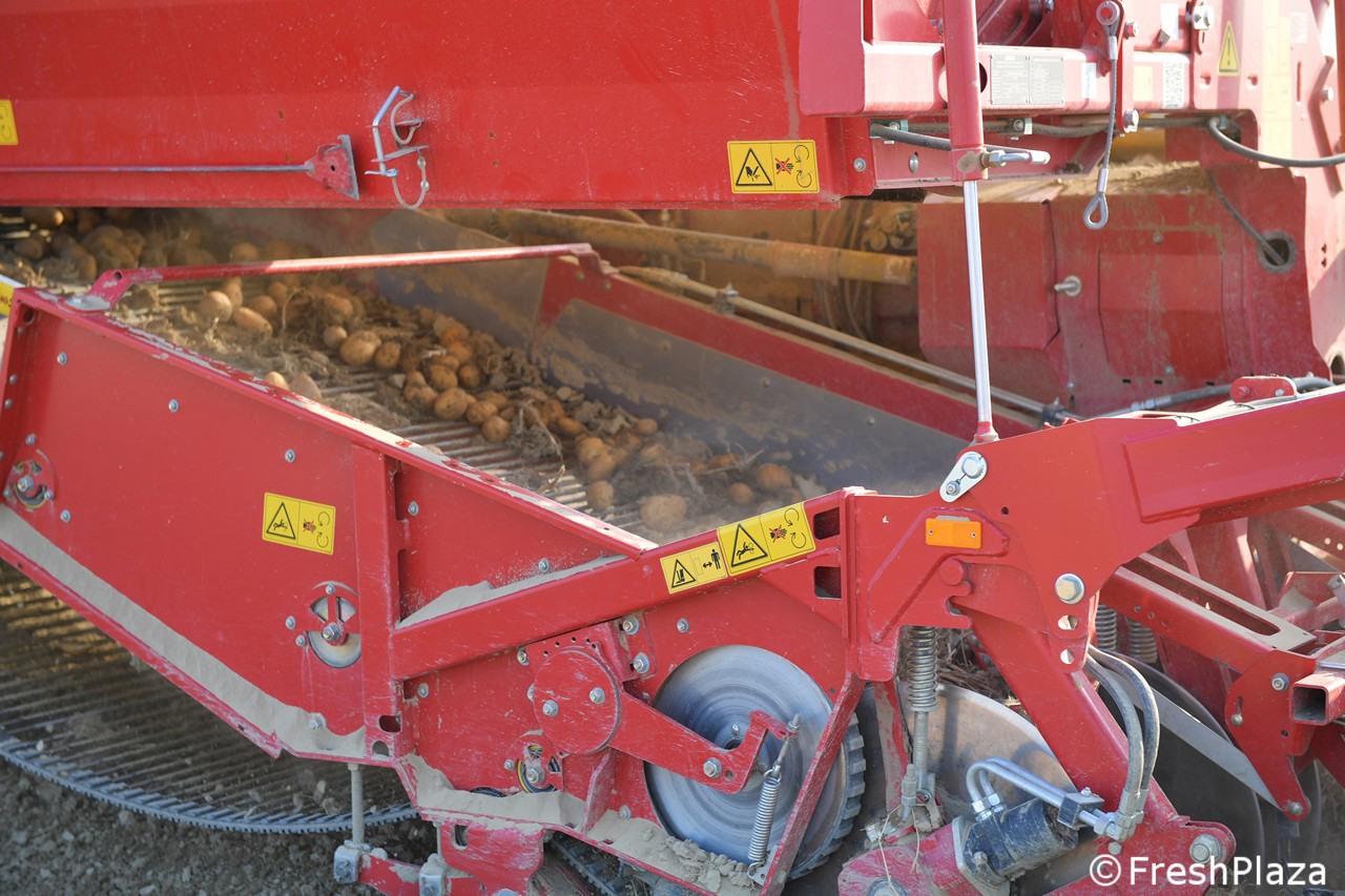Le patate, raccolte dalla macchina che lavora su due file, salgono superiormente e perdono la terra rimasta eventualmente attaccata