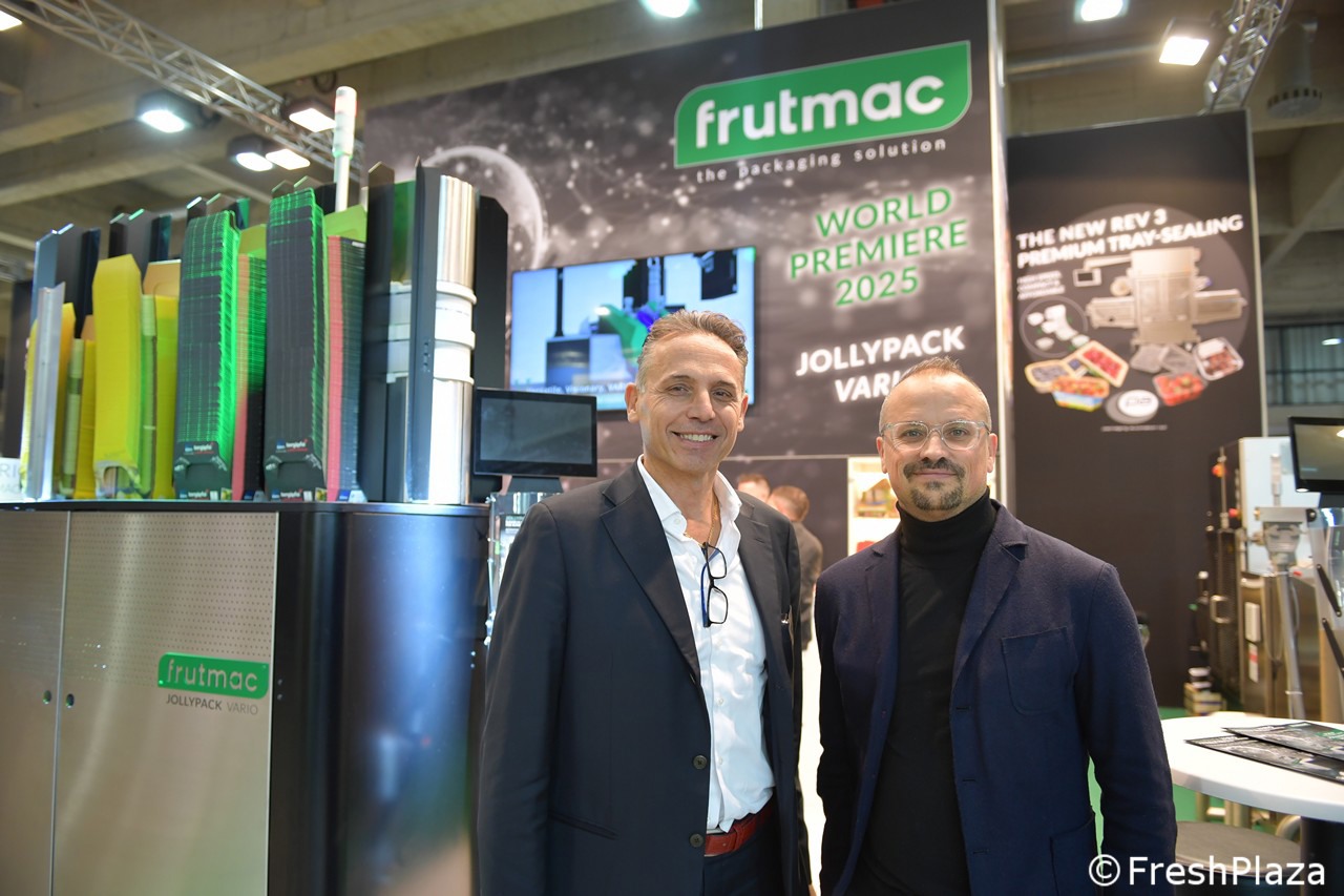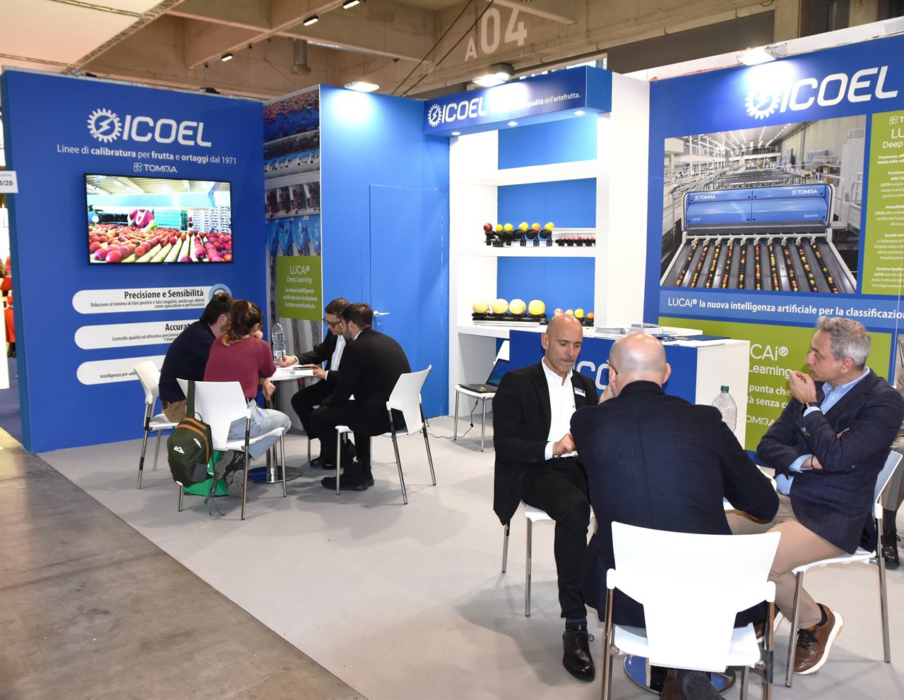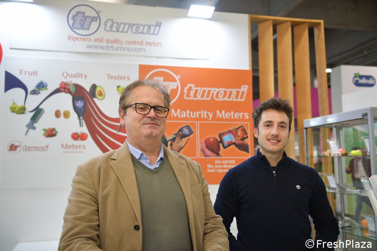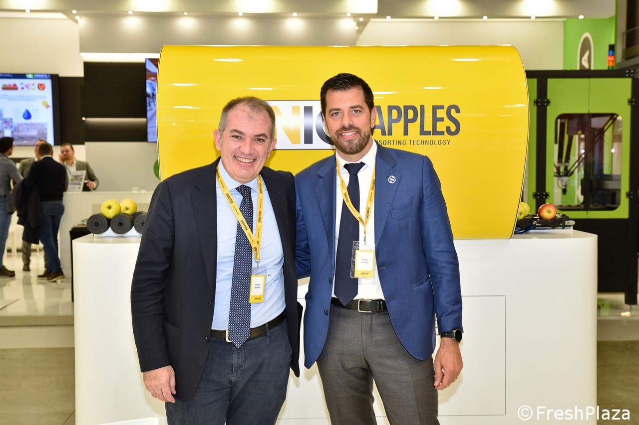 Raffaele Benedetti e Andrea Zecchini presso lo stand UNITEC-Unisorting, all'avanguardia nei sistemi di valutazione della qualità esterna e interna di diverse tipologie di frutta, con enormi benefici per le centrali ortofrutticole.