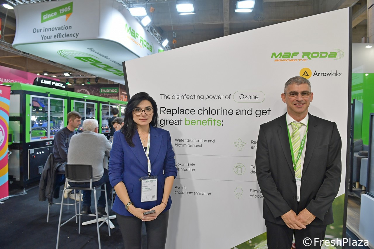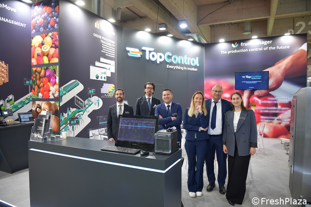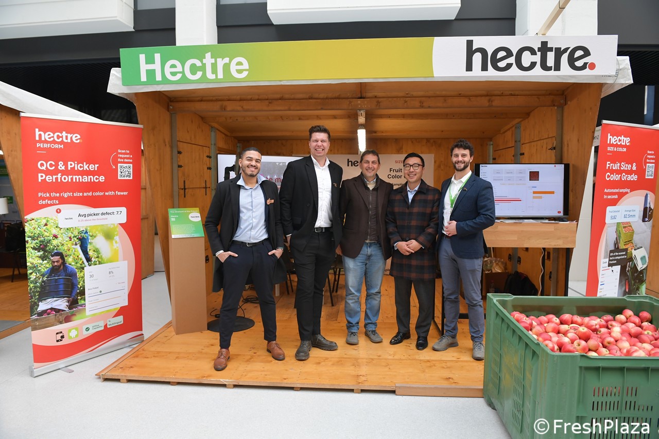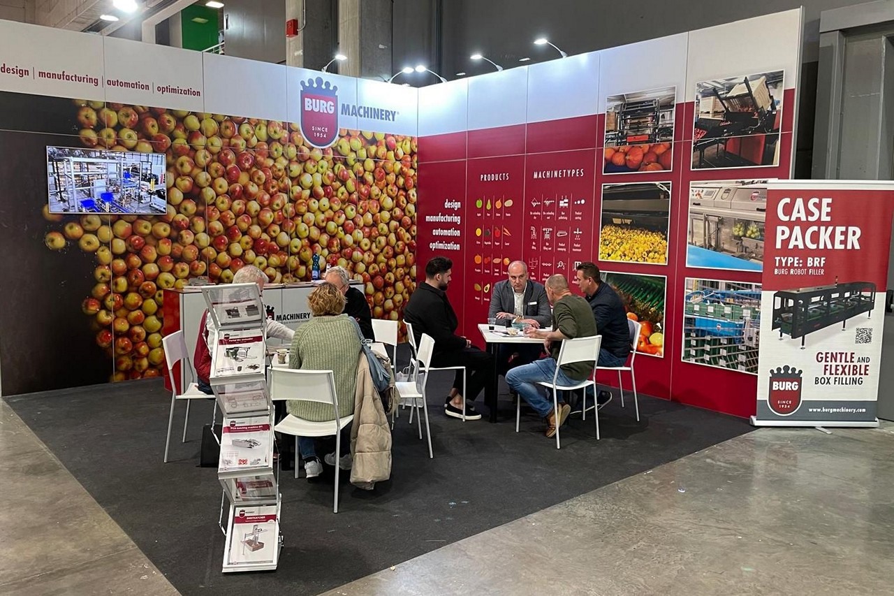 Raffaele Benedetti e Andrea Zecchini presso lo stand UNITEC-Unisorting, all'avanguardia nei sistemi di valutazione della qualità esterna e interna di diverse tipologie di frutta, con enormi benefici per le centrali ortofrutticole.
