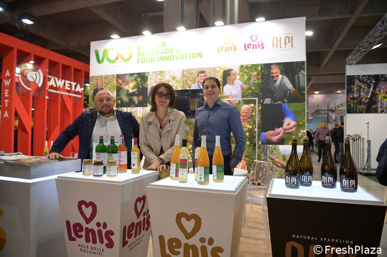 Leni's, marchio commerciale della divisione Vog Products. Da sinistra Alexander Zambiasi, Jutta Perkmann, Michael Marth. A destra, le nuove proposte di vino aromatizzato alla mela