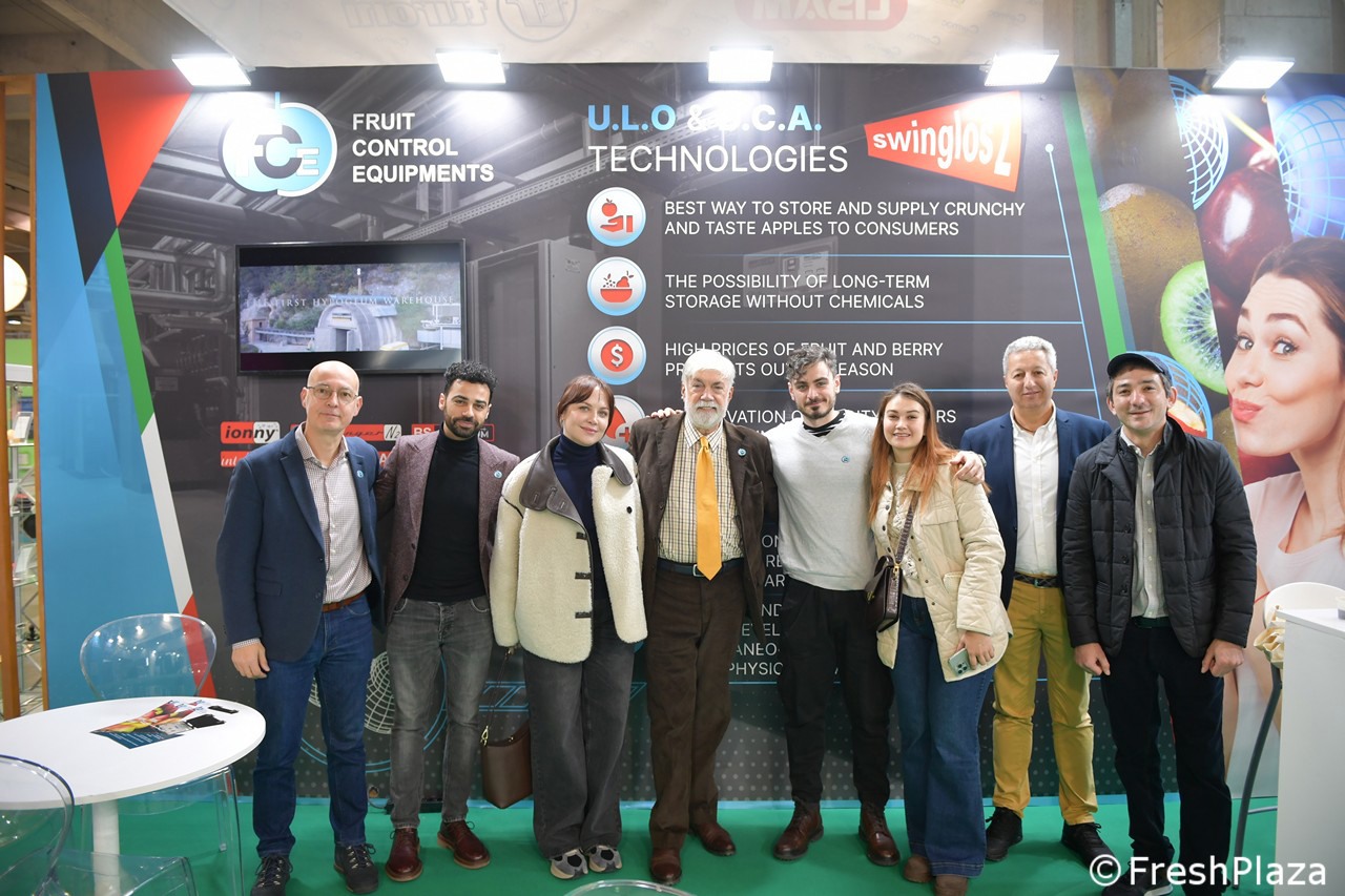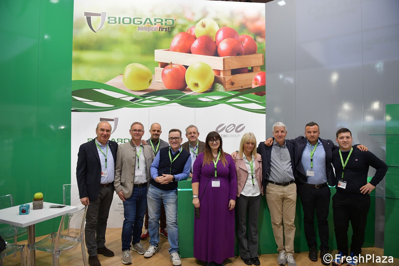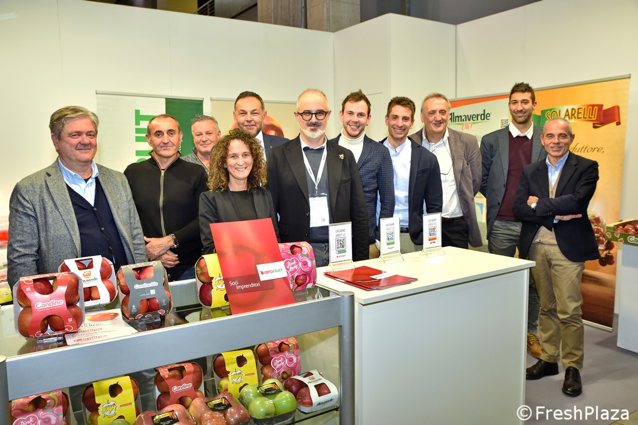 Foto di gruppo allo stand Apofruit, impresa cooperativa che da oltre 60 anni opera con proprie strutture e Soci produttori dal nord al sud dell'Italia.