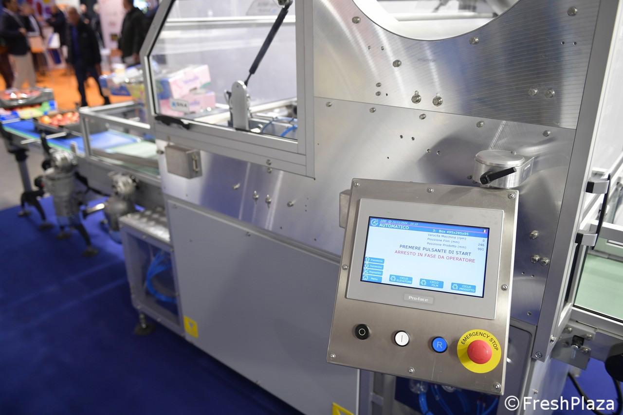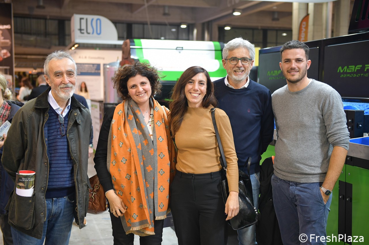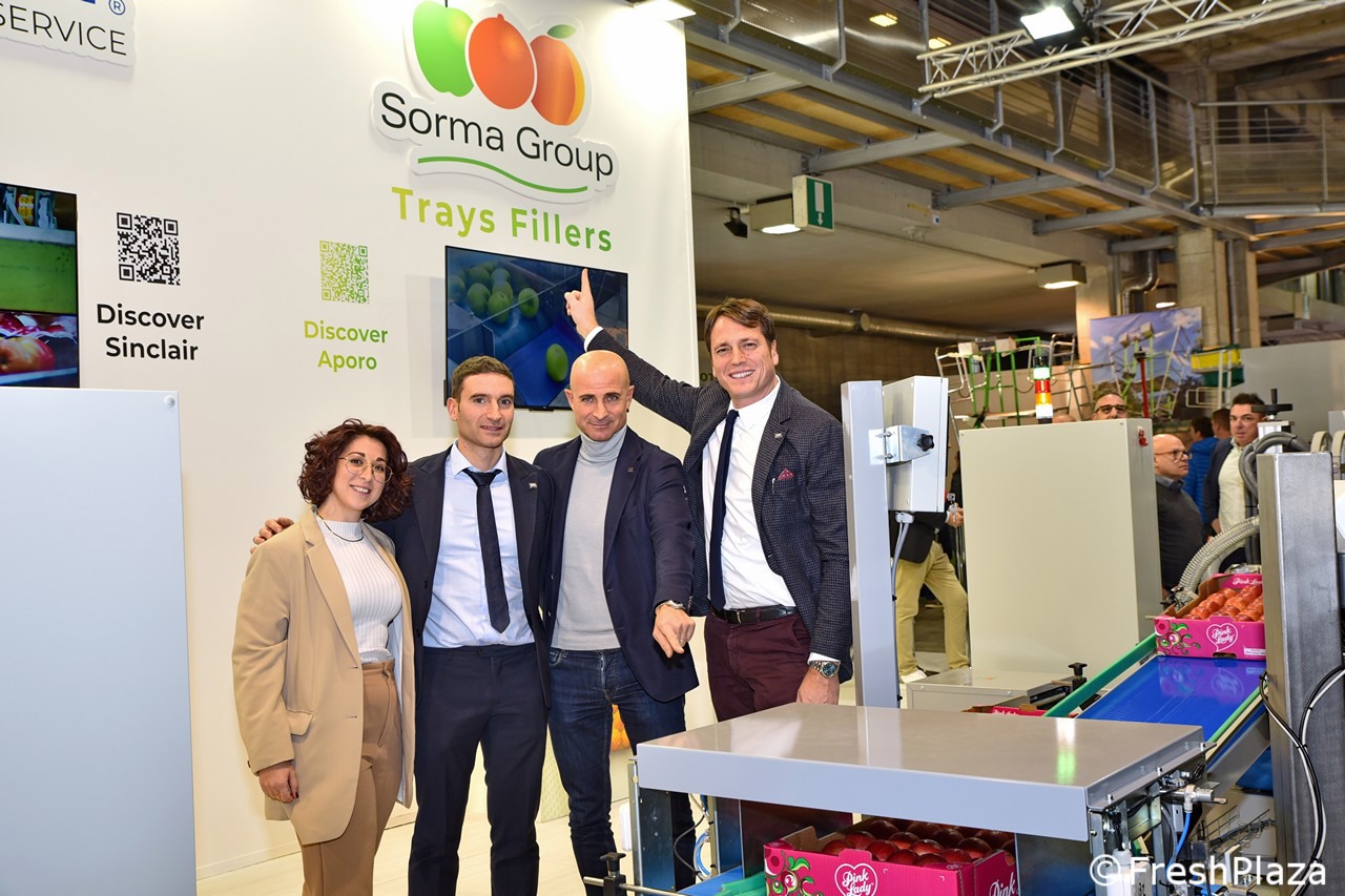 Ad animare lo stand della Sorma: Silvia Albanese, Alberto Agostini, Andrea Casali, Francesco Semprini. Tra le diverse soluzioni per automatizzare i processi negli stabilimenti di lavorazione delle mele, Sorma ha sviluppato anche Aporo, che con un braccio robotico multitesta pick and place è in grado, sulla base delle esigenze dell'utilizzatore, di gestire da 220 a 300 frutti al minuto e di generare un risparmio di manodopera fino a 5 operatori.