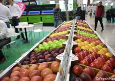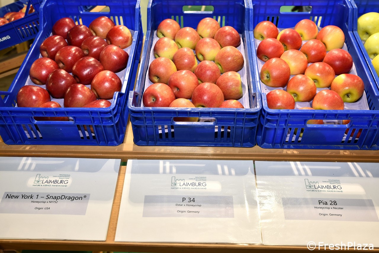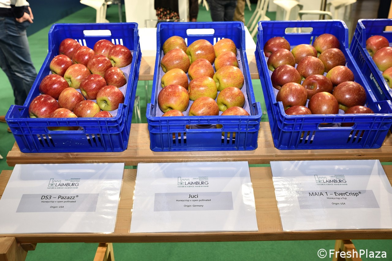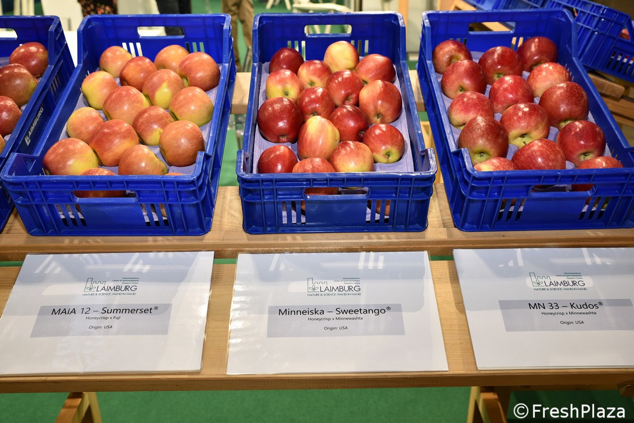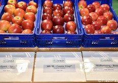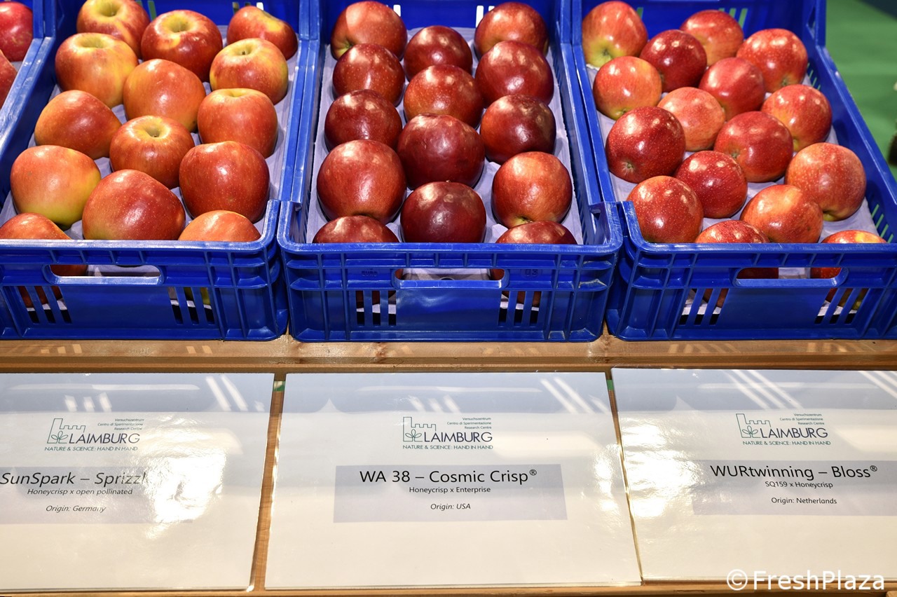 Qui e nelle foto seguenti, una carrellata di selezioni di mele in esposizione presso lo stand del Centro di sperimentazione Laimburg.