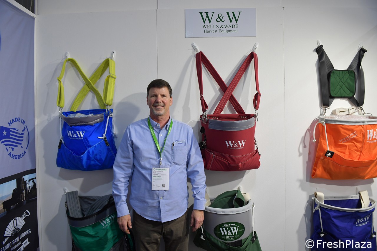 Jeff Martin, presidente di SFE. In fiera a Interpoma, fra le varie attrezzature ha portato una particolare sacca agevolatrice per la raccolta