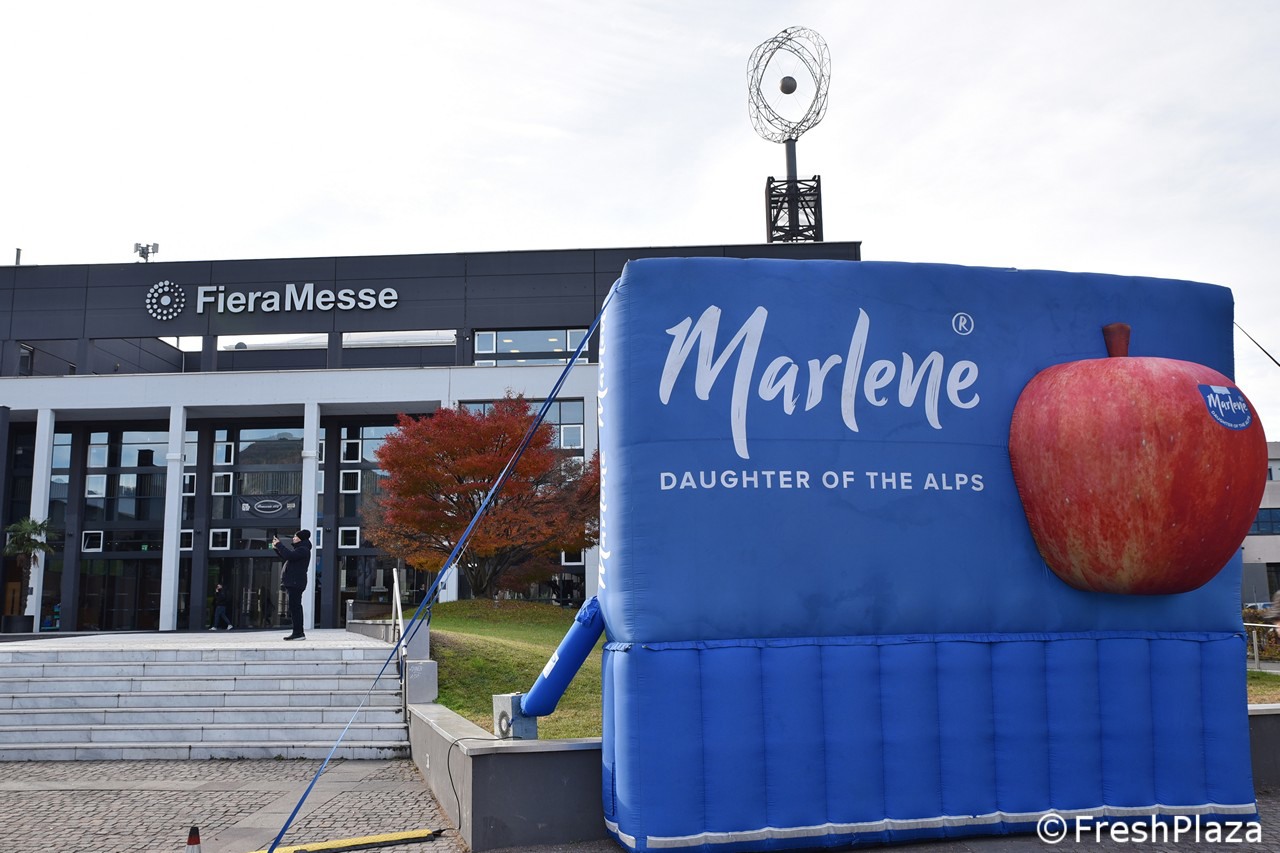 Un gonfiabile pubblicitario dedicato alla mela Marlene, installato di fronte alla struttura fieristica.