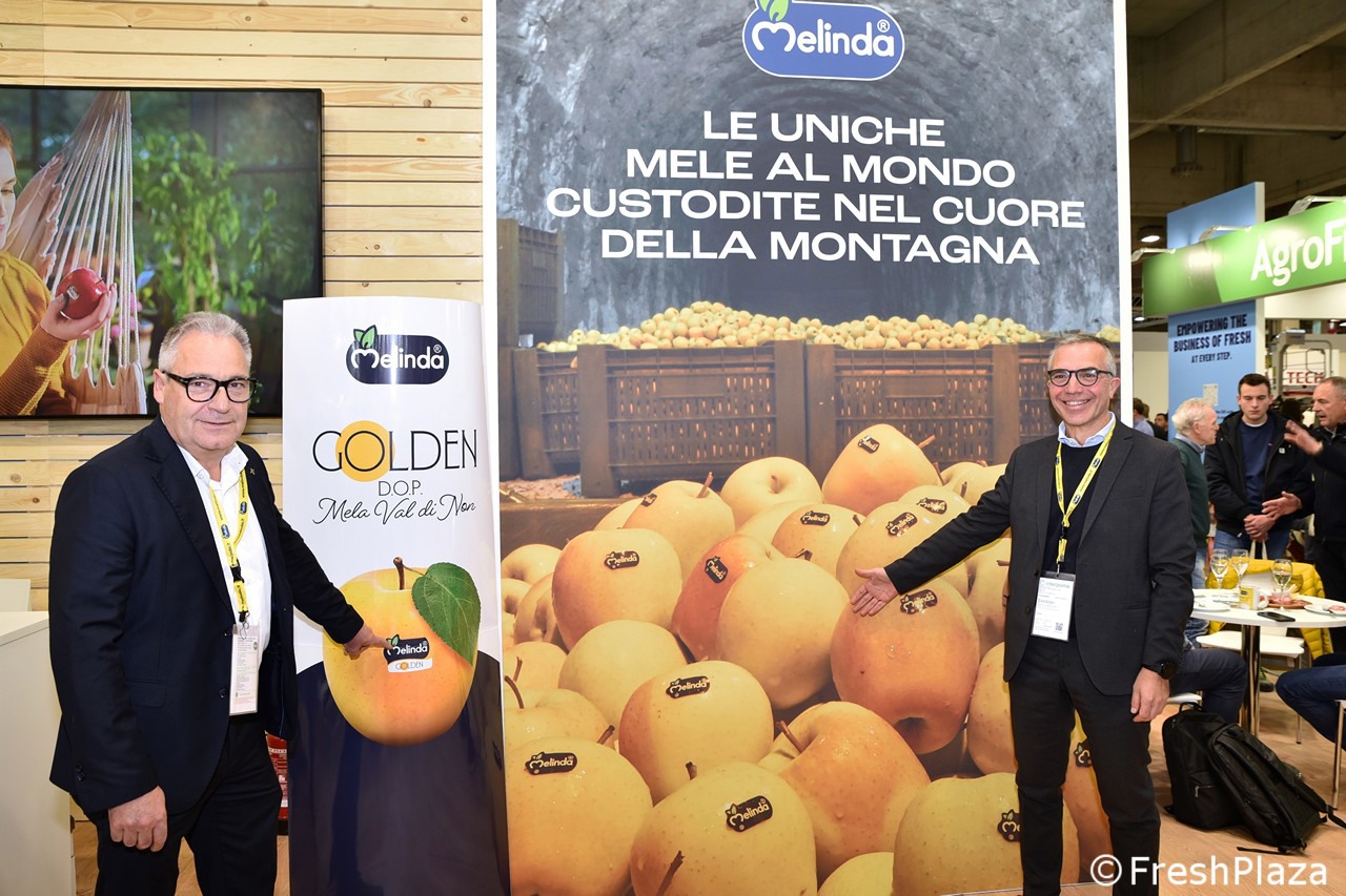 Il presidente Melinda Ernesto Seppi insieme al direttore Luca Zaglio. La mela Golden è la varietà portabandiera nell'assortimento a marchio Melinda.