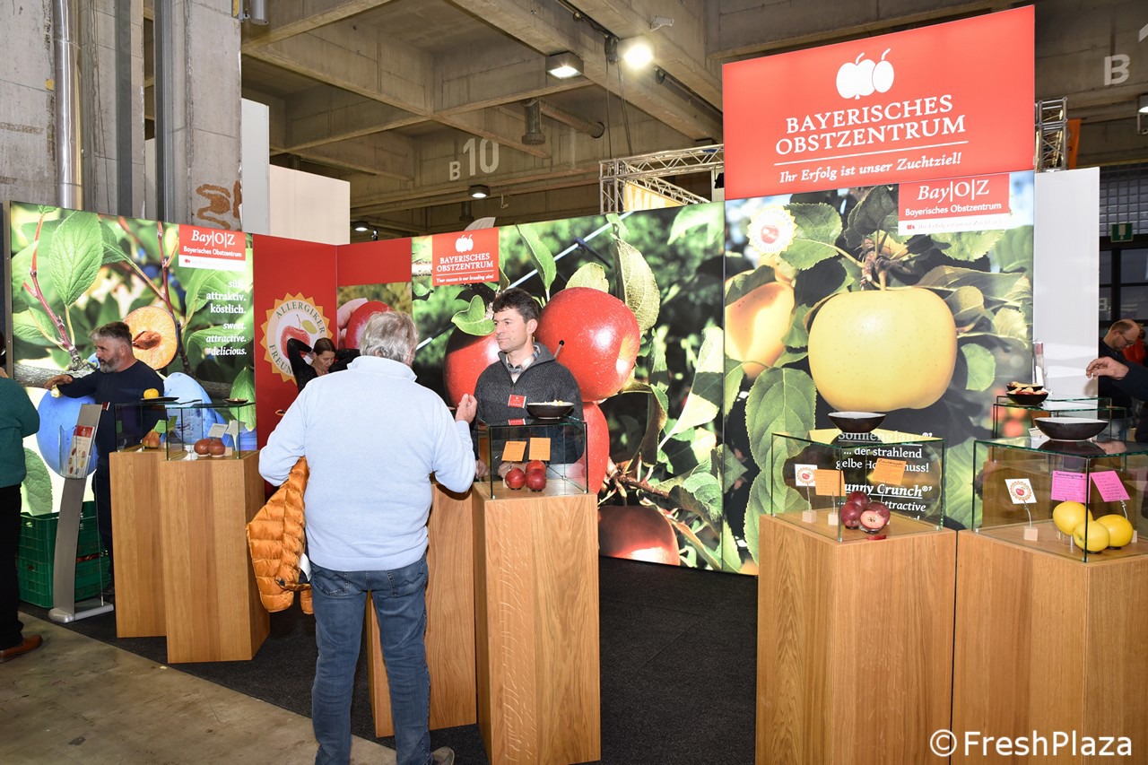 Lo stand del Centro bavarese di pomologia e di breeding della frutta. In foto, il breeder Michael Neumueller a colloquio con un visitatore interessato.