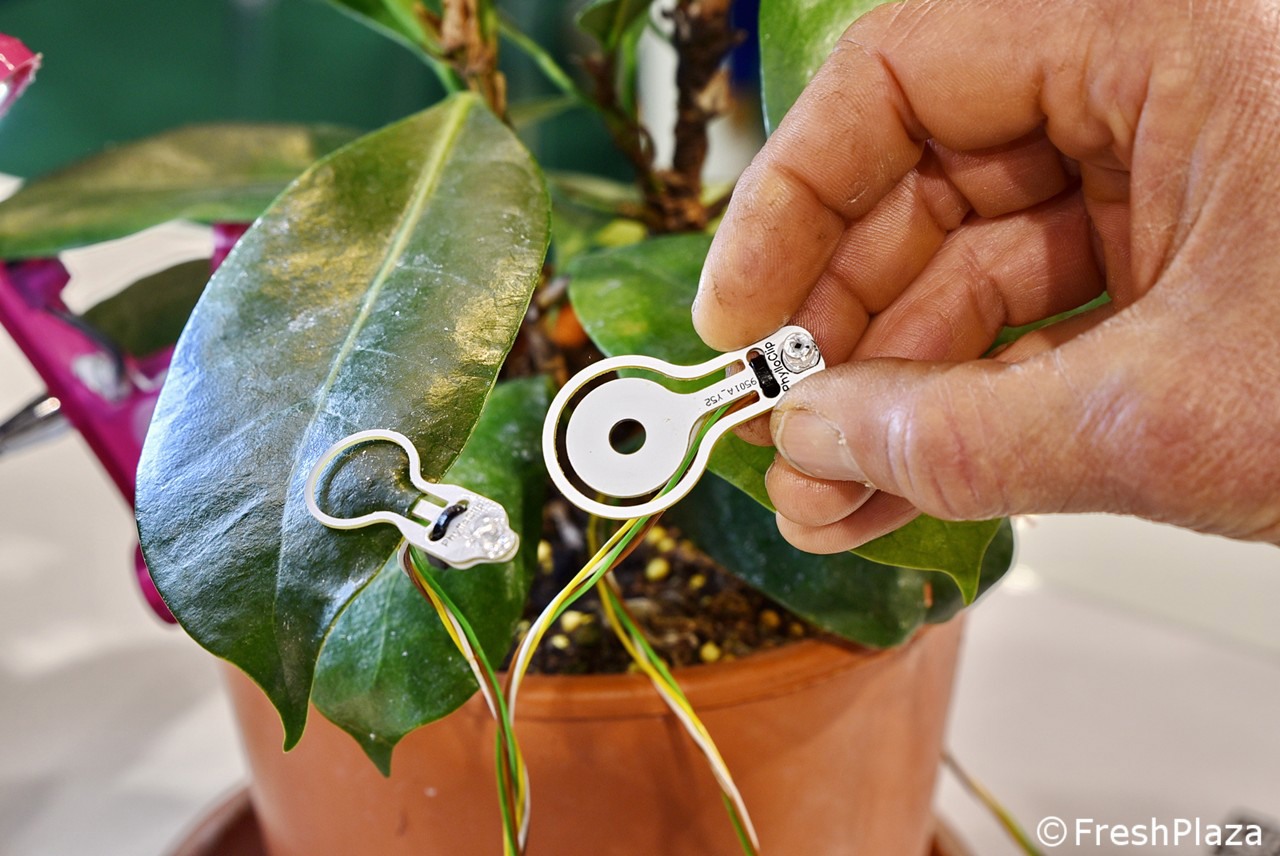 Dettaglio del sensore fogliare Fylloclip, un dispositivo economico e di facilissima applicazione, dotato di un trasmettitore radio alimentato da 2 semplici pile stilo, per la rilevazione in tempo reale dei tassi di insolazione e traspirazione della pianta. La comparazione tra i grafici prodotti nel corso della giornata consente al coltivatore di conoscere in dettaglio eventuali stress idrici della pianta e intervenire miratamente.